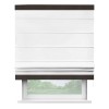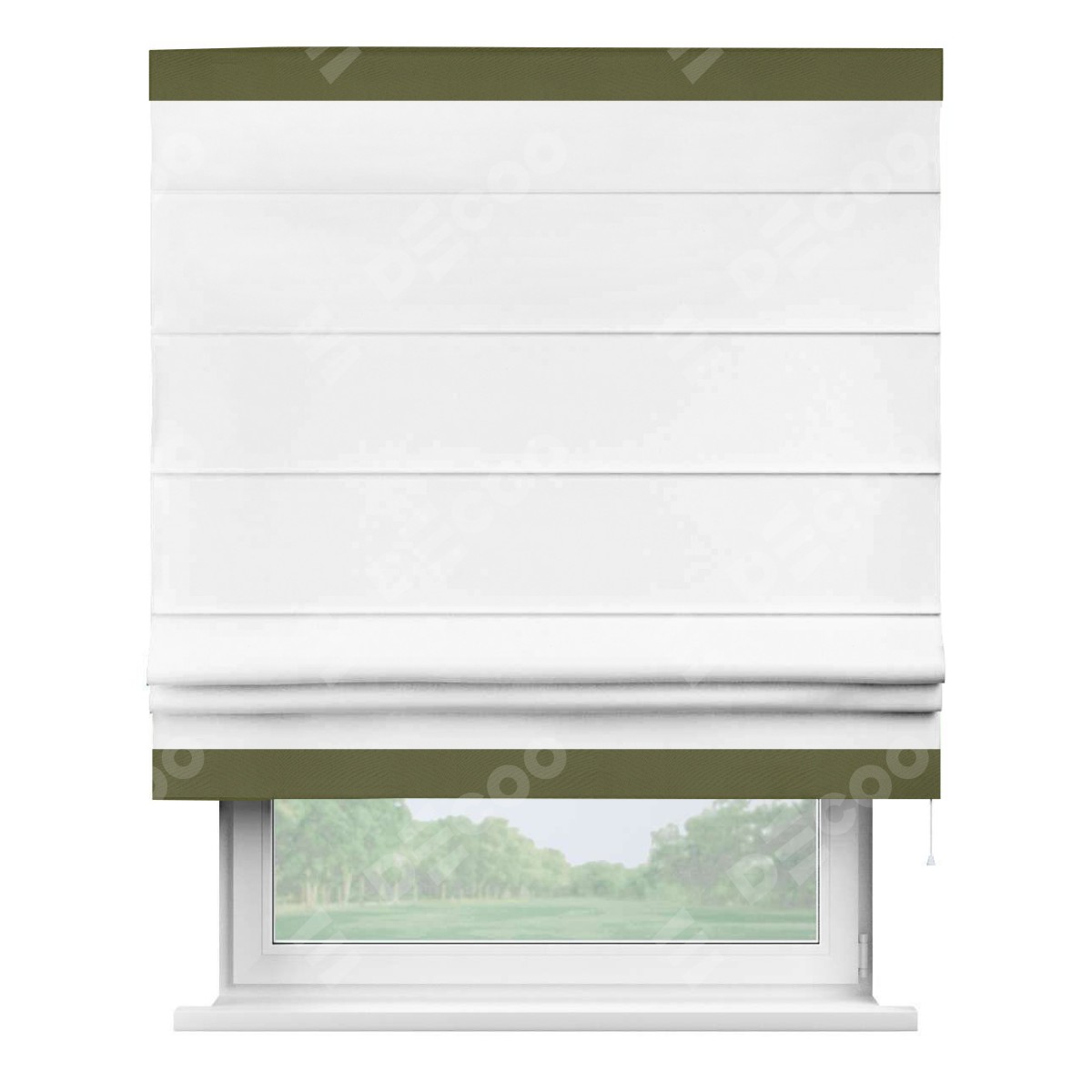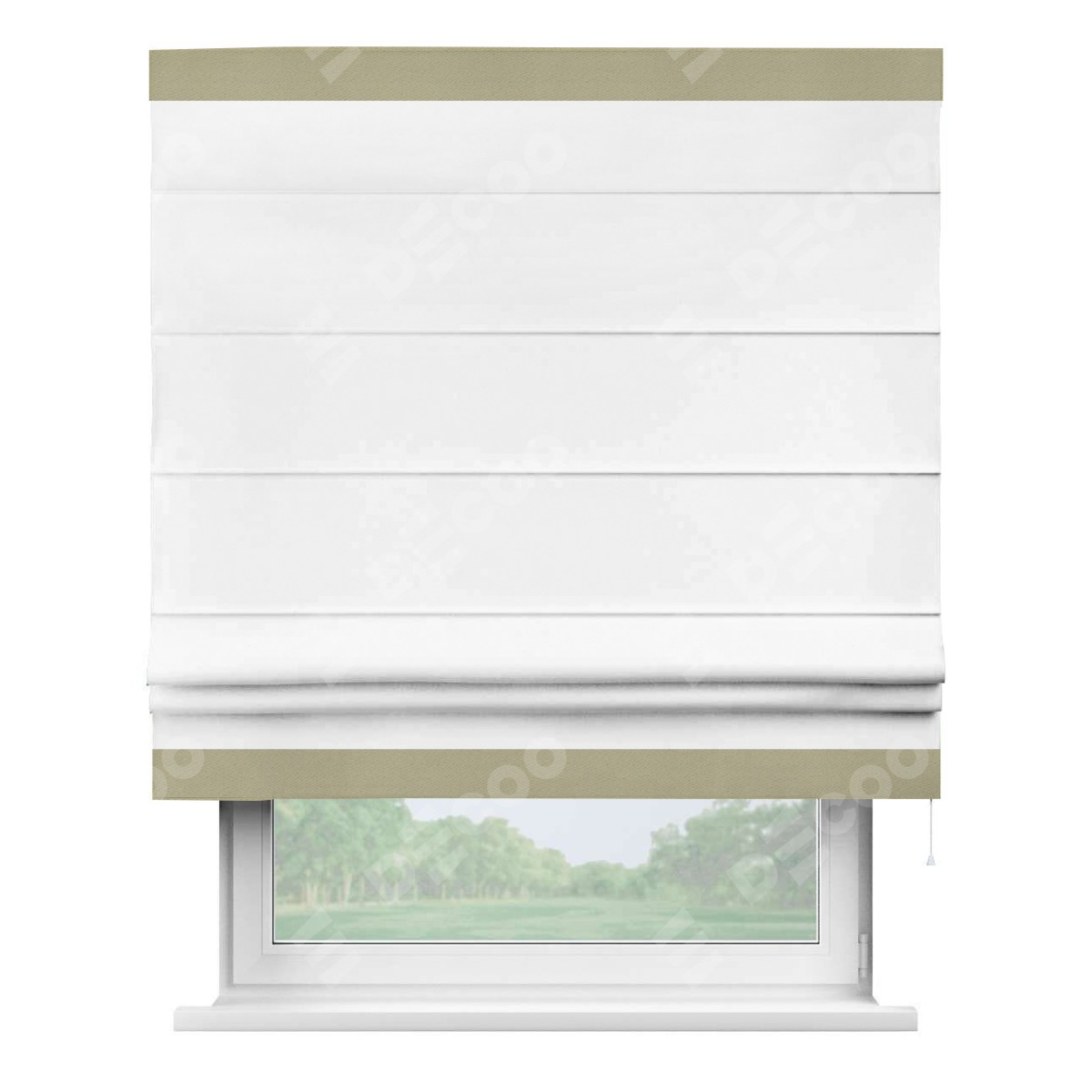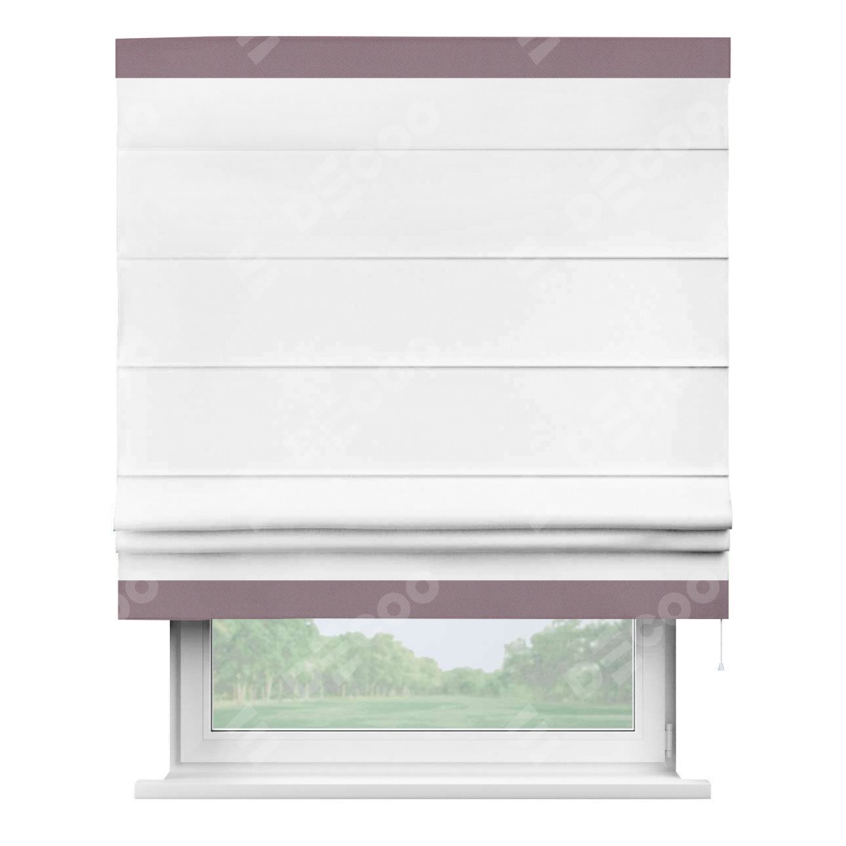 Римская штора производителя «Cortin», используется для проёма, пошита из ткани однотонная белоснежная, артикул ткани 41217. Отделка шторы кантом «Горизонт», ткань для канта используется из блэкаута однотонного разной расцветки на выбор. Имеет универсальный механизм и подходит для монтажа: на потолок, на стену и в нишу.