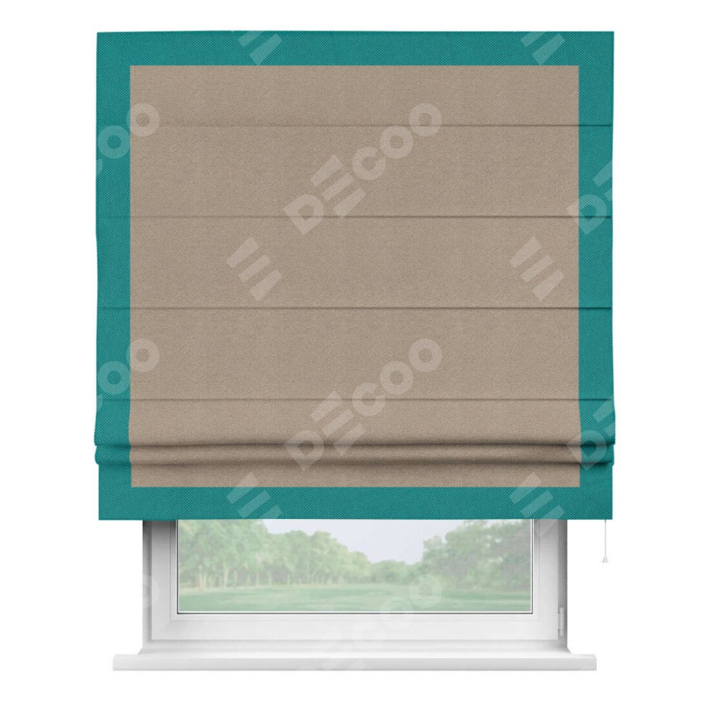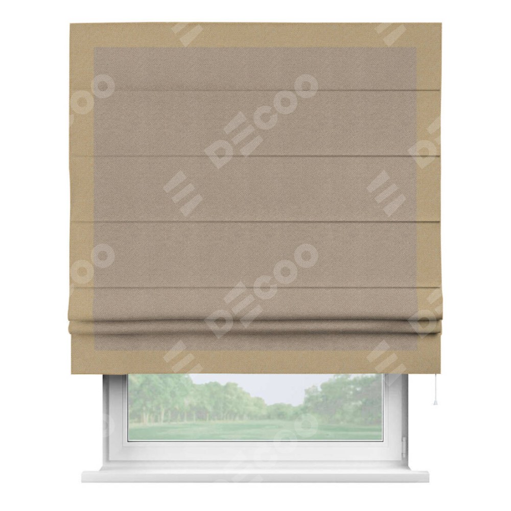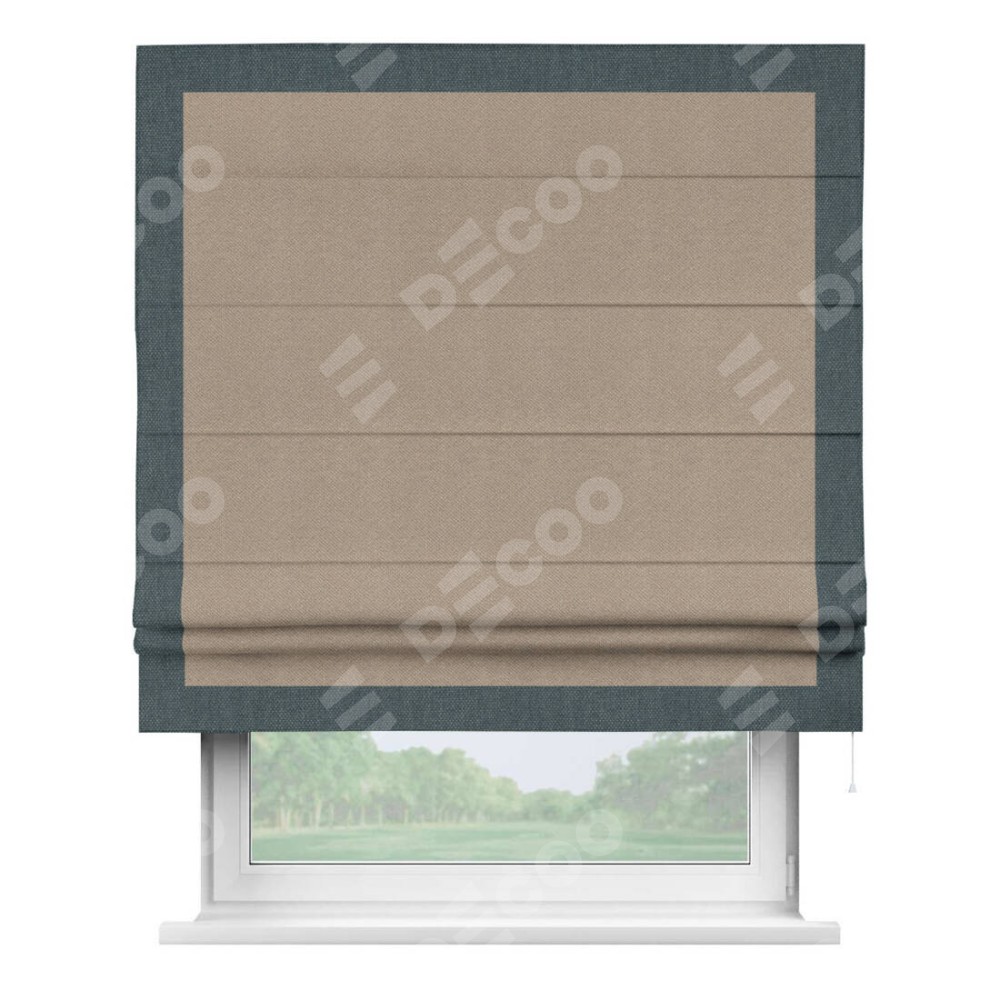 Римская штора производителя «Cortin», используется для проёма, пошита из ткани лён димаут светло-бежевый, артикул 00002. Отделка шторы кантом «Чесс», ткань для канта используется из льна димаут разной расцветки на выбор. Имеет универсальный механизм и подходит для монтажа: на потолок, на стену и в нишу.
