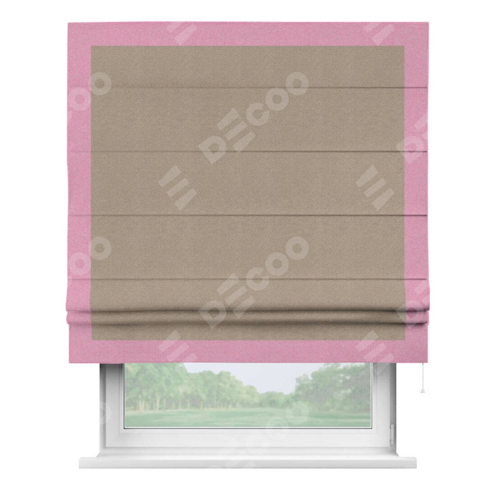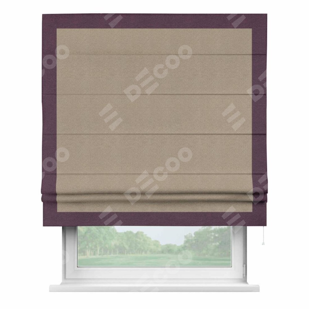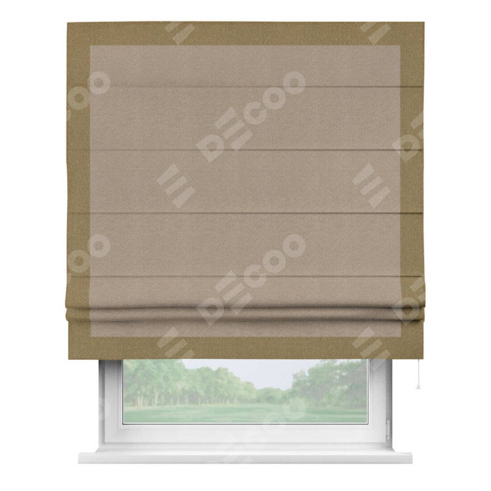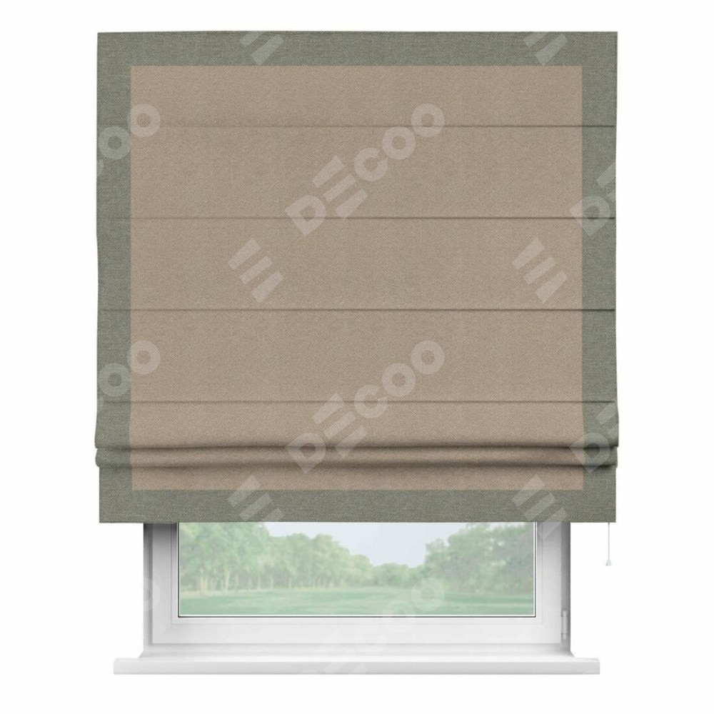 Римская штора производителя «Cortin», используется для проёма, пошита из ткани лён димаут светло-бежевый, артикул 00002. Отделка шторы кантом «Чесс», ткань для канта используется из льна димаут разной расцветки на выбор. Имеет универсальный механизм и подходит для монтажа: на потолок, на стену и в нишу.