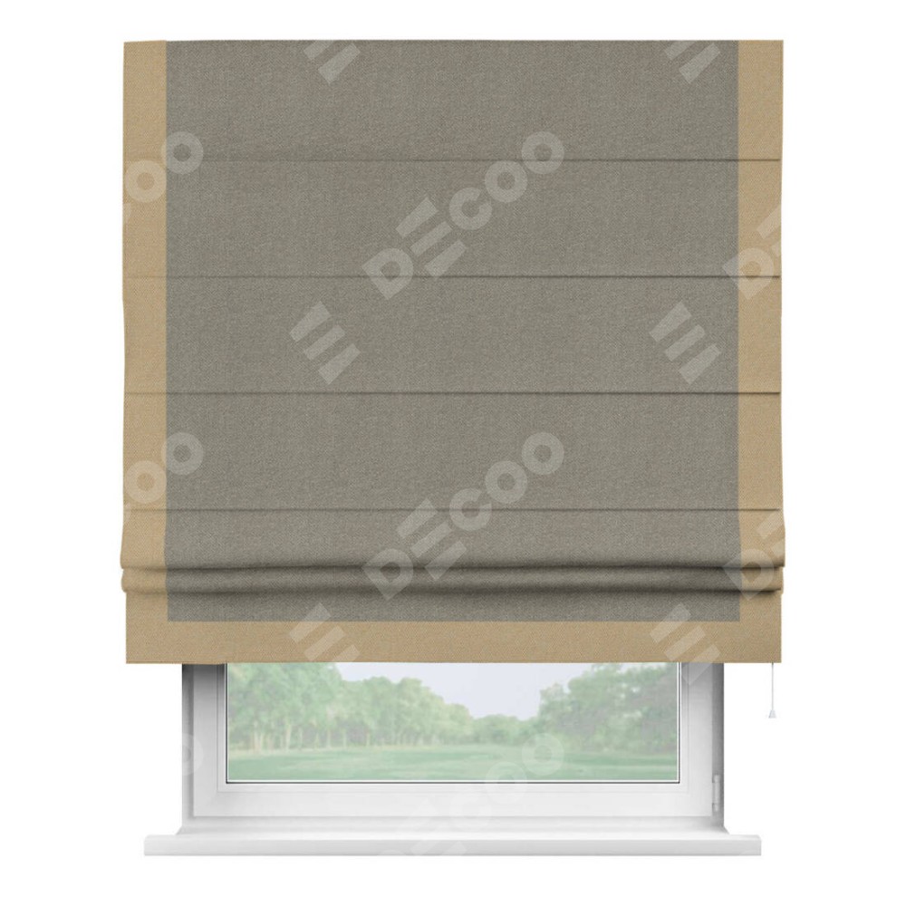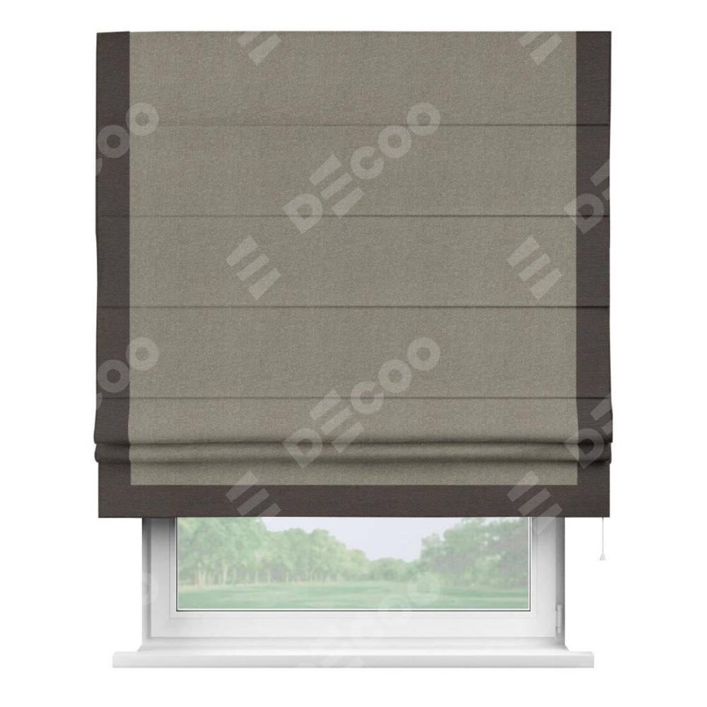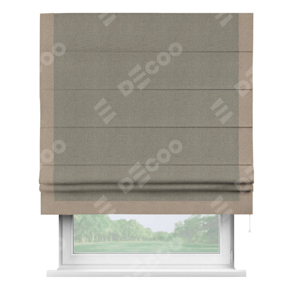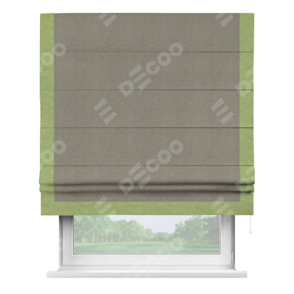 Римская штора производителя «Cortin», используется для проёма, пошита из ткани лён димаут cеро-зелёный, артикул 00003. Отделка шторы кантом «Виктория», ткань для канта используется из льна димаут разной расцветки на выбор. Имеет универсальный механизм и подходит для монтажа: на потолок, на стену и в нишу.