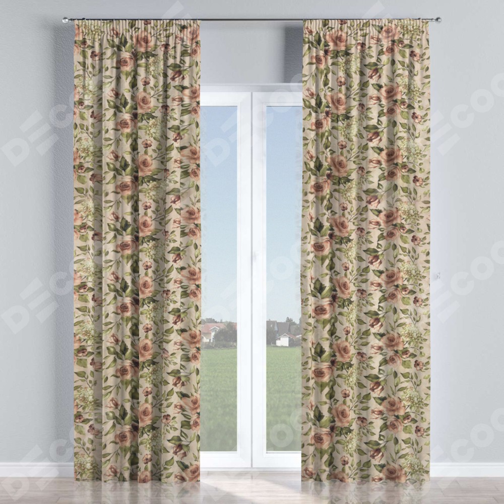 Комплект прямых штор, от производителя «Cortin», пошиты из ткани «Розы бежевые», артикул ткани 34564. С изнаночной стороны в верхней части штор пристрачивается шторная лента с декоративными складками «Карандаш». Для создания элегантных складок прямые шторы шьются по стандарту с коэффициентом 1:2 (на 100 см. ширины проёма 200 см. ширины ткани).