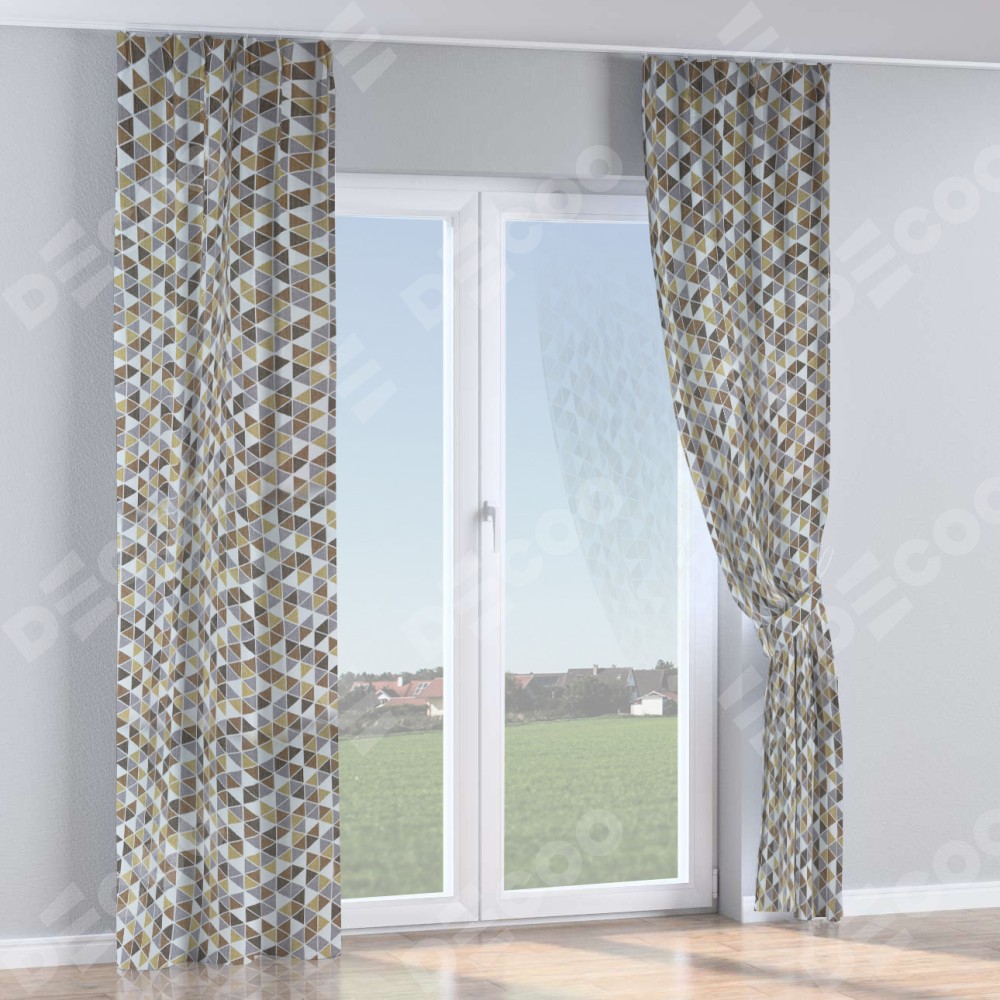 Комплект прямых штор, от производителя «Cortin», пошиты из ткани димаут «Треугольники коричневые», артикул ткани 23021. С изнаночной стороны в верхней части штор пристрачивается шторная лента с декоративными складками «Кустик». Для создания элегантных складок прямые шторы шьются по стандарту с коэффициентом 1:2 (на 100 см. ширины проёма 200 см. ширины ткани).