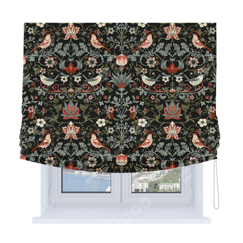 Римская штора Soft производителя «Cortin», используется для проёма, пошита из ткани блэкаут с нанесением сублимационной печати «Зачарованные птицы». Имеет универсальный механизм и подходит для монтажа: на потолок, на стену и в нишу. В отличие от стандартных римских штор, римская штора Soft не имеет горизонтальных вставок и нижнего отвеса. Это позволяет ткани произвольно драпироваться в свободные мягкие складки.