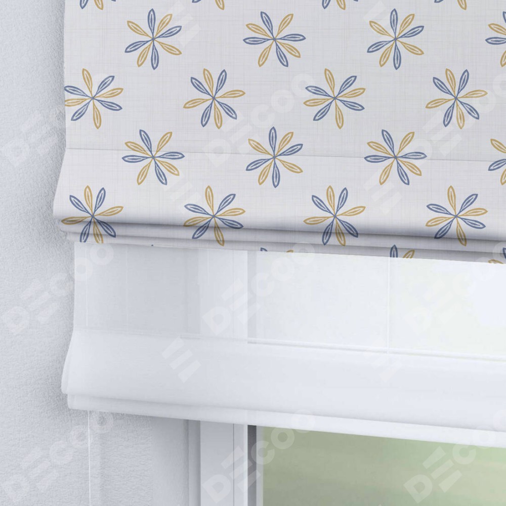 Римская штора день-ночь производителя «Cortin», используется для проёма, пошита из двух полотен, с лицевой блэкаут с нанесением сублимационной печати «Ромашки кантри», вторая ткань тюль (по стандарту комплектуется тюль белого цвета артикул V-01). Имеет универсальный механизм и подходит для монтажа: на потолок, на стену и в нишу.