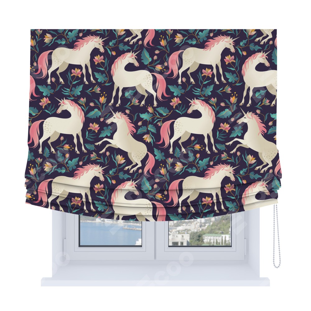 Римская штора Soft производителя «Cortin», используется для проёма, пошита из ткани блэкаут с нанесением сублимационной печати «Сказочные единороги». Имеет универсальный механизм и подходит для монтажа: на потолок, на стену и в нишу. В отличие от стандартных римских штор, римская штора Soft не имеет горизонтальных вставок и нижнего отвеса. Это позволяет ткани произвольно драпироваться в свободные мягкие складки.