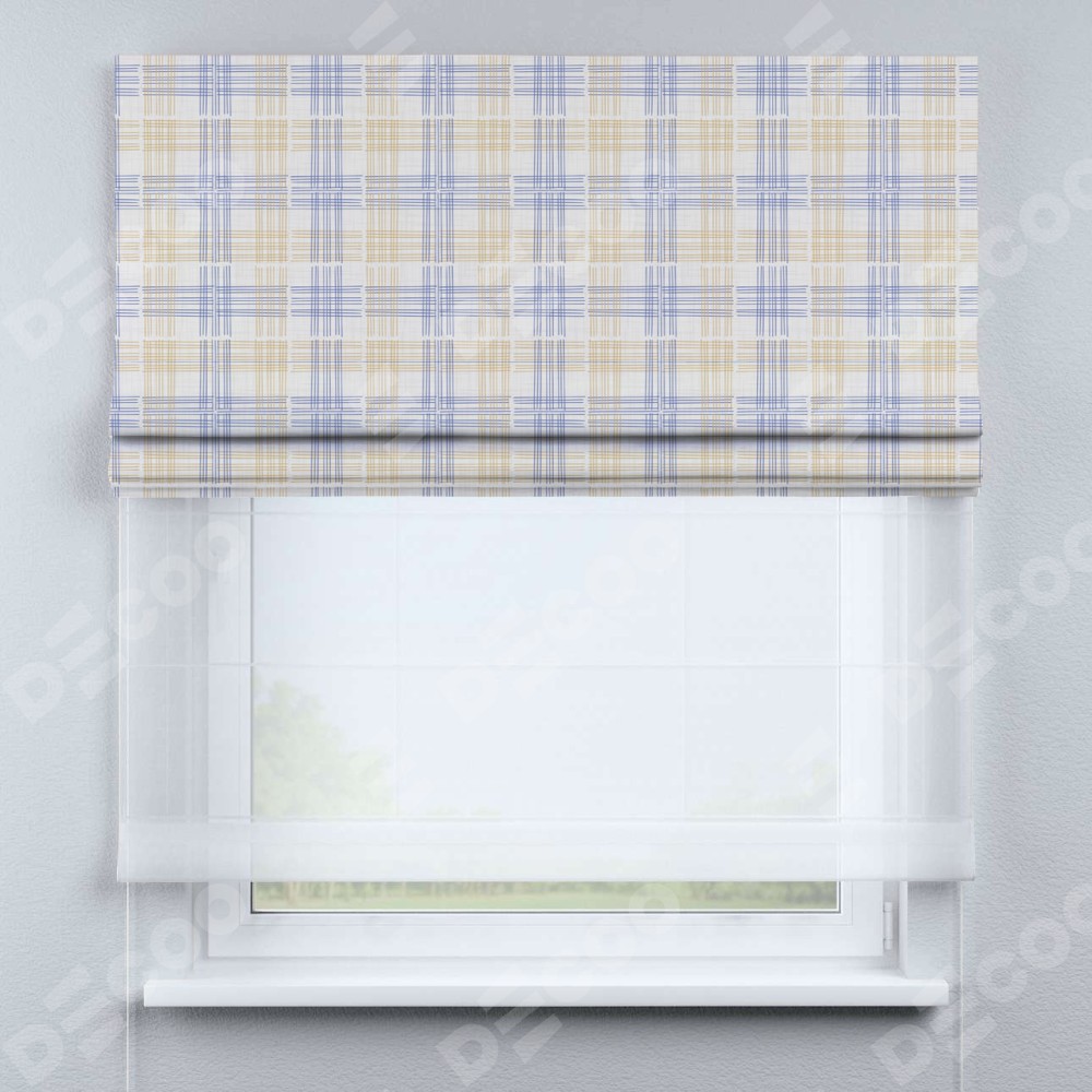 Римская штора день-ночь производителя «Cortin», используется для проёма, пошита из двух полотен, с лицевой блэкаут с нанесением сублимационной печати «Клетки кантри», вторая ткань тюль (по стандарту комплектуется тюль белого цвета артикул V-01). Имеет универсальный механизм и подходит для монтажа: на потолок, на стену и в нишу.