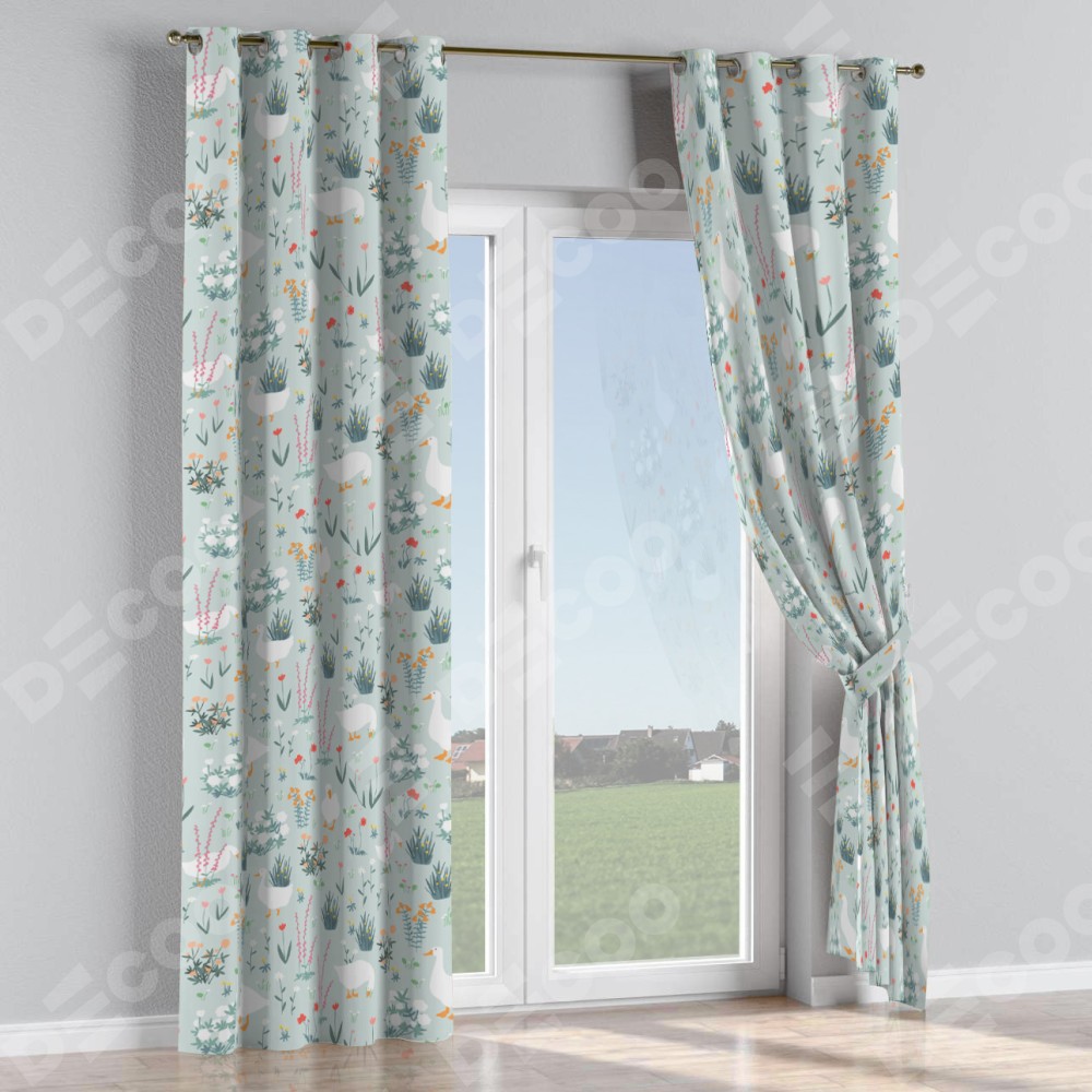 Комплект прямых штор, от производителя «Cortin», пошиты из ткани блэкаут с нанесением сублимационной печати «Гуси на лугу». Данная модель пошита на люверсах, комплектуется на выбор круглым карнизом и подходит для монтажа на стену или потолок. Прямые шторы на люверсах шьются по стандарту с коэффициентом 1/2 (на 100 см. ширины проёма 200 см. ширины ткани), отличительным преимуществом данной модели является простой способ монтажа. Достаточно повесить ее на трубу и штора готова!
