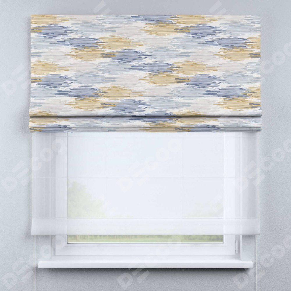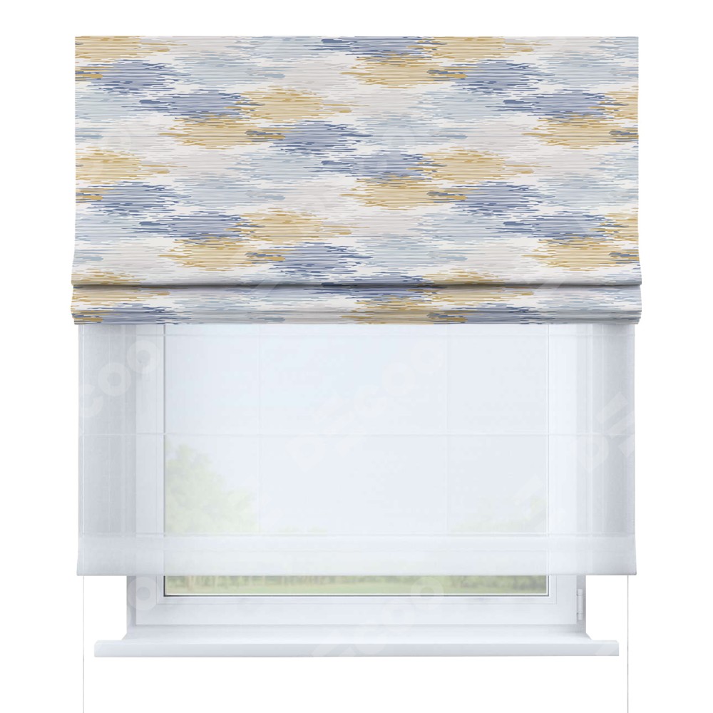 Римская штора день-ночь производителя «Cortin», используется для проёма, пошита из двух полотен, с лицевой блэкаут с нанесением сублимационной печати «Полосатая волна», вторая ткань тюль (по стандарту комплектуется тюль белого цвета артикул V-01). Имеет универсальный механизм и подходит для монтажа: на потолок, на стену и в нишу.