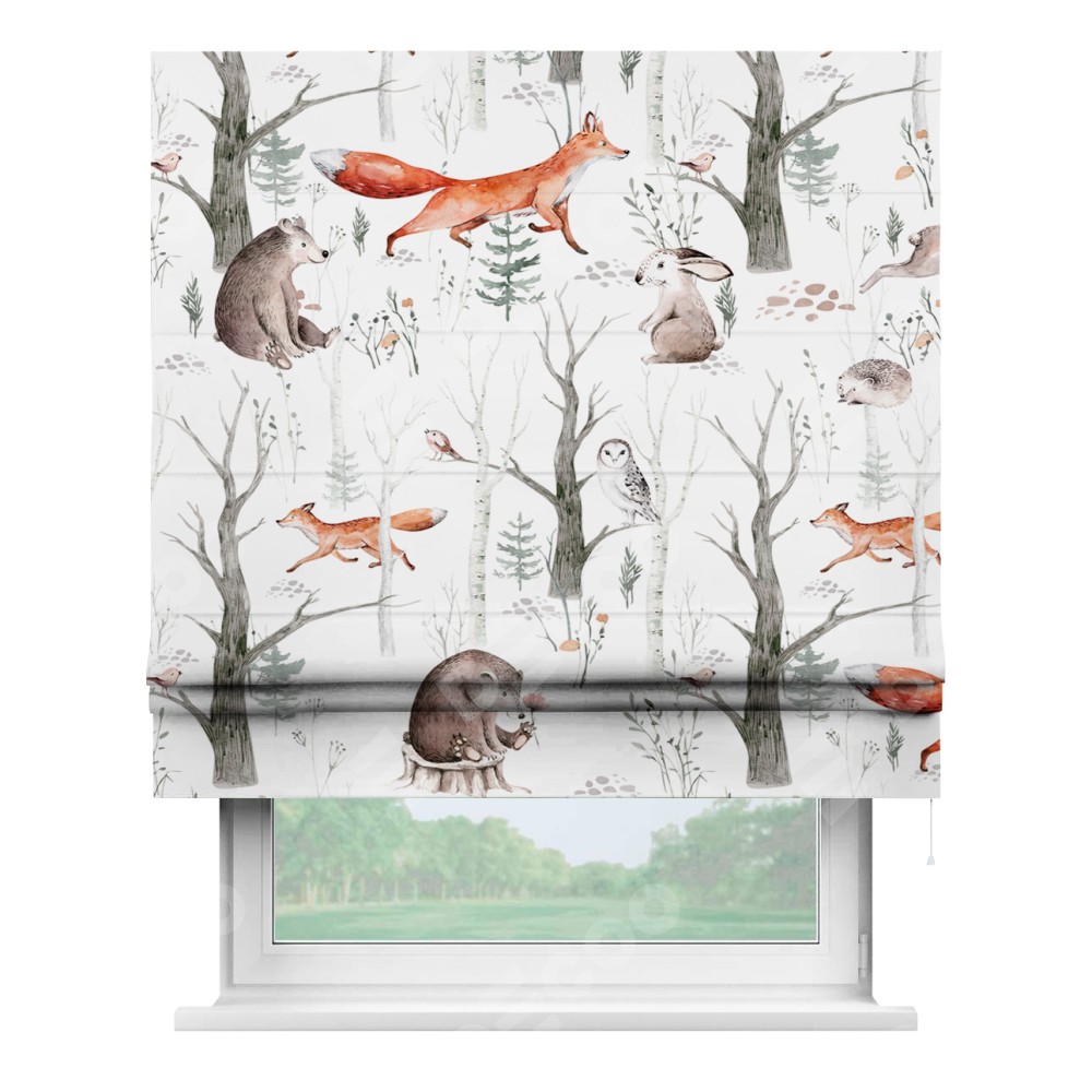 Римская штора производителя «Cortin», используется для проёма, пошита из ткани блэкаут с нанесением сублимационной печати «Лесной питомник». Имеет универсальный механизм и подходит для монтажа: на потолок, на стену и в нишу.