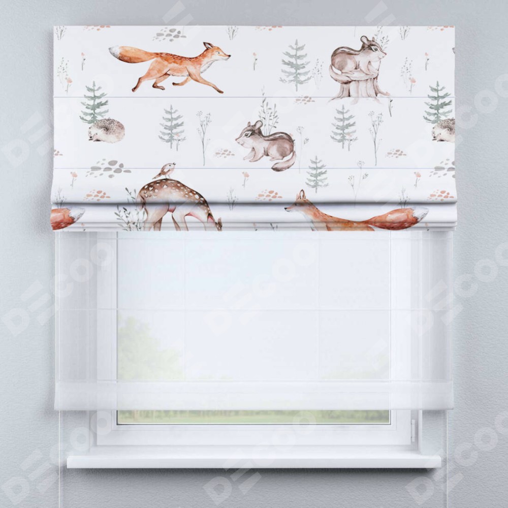 Римская штора день-ночь производителя «Cortin», используется для проёма, пошита из двух полотен, с лицевой блэкаут с нанесением сублимационной печати «Пушистый питомник», вторая ткань тюль (по стандарту комплектуется тюль белого цвета артикул V-01). Имеет универсальный механизм и подходит для монтажа: на потолок, на стену и в нишу.