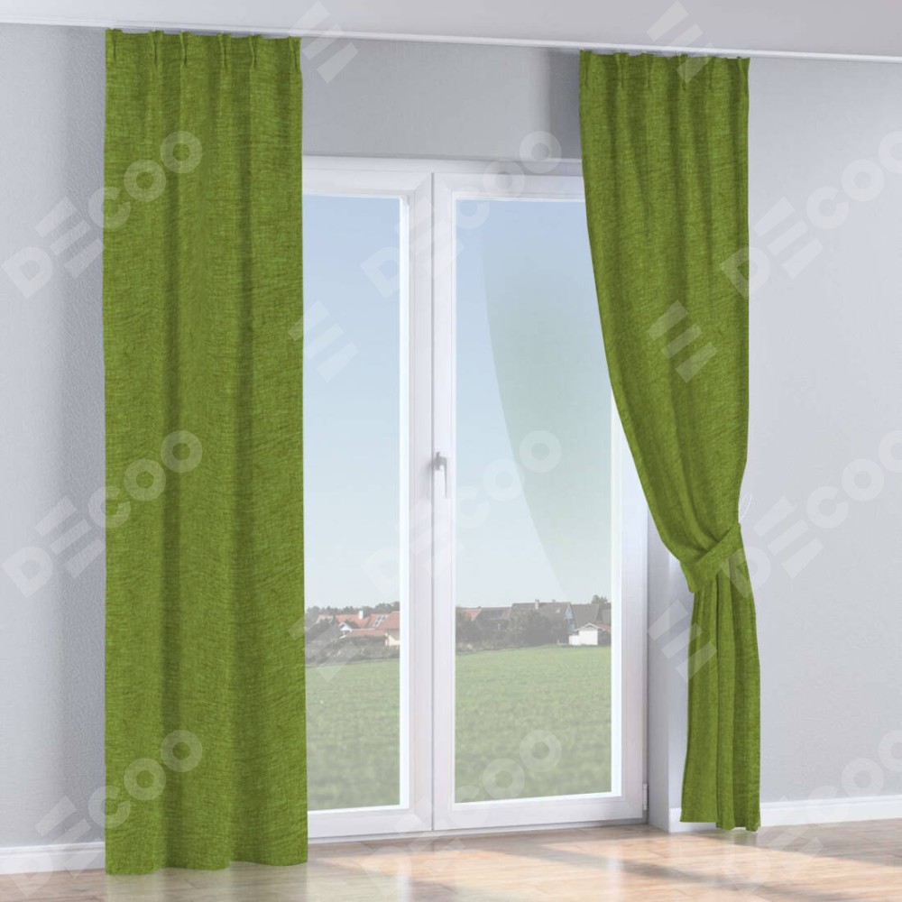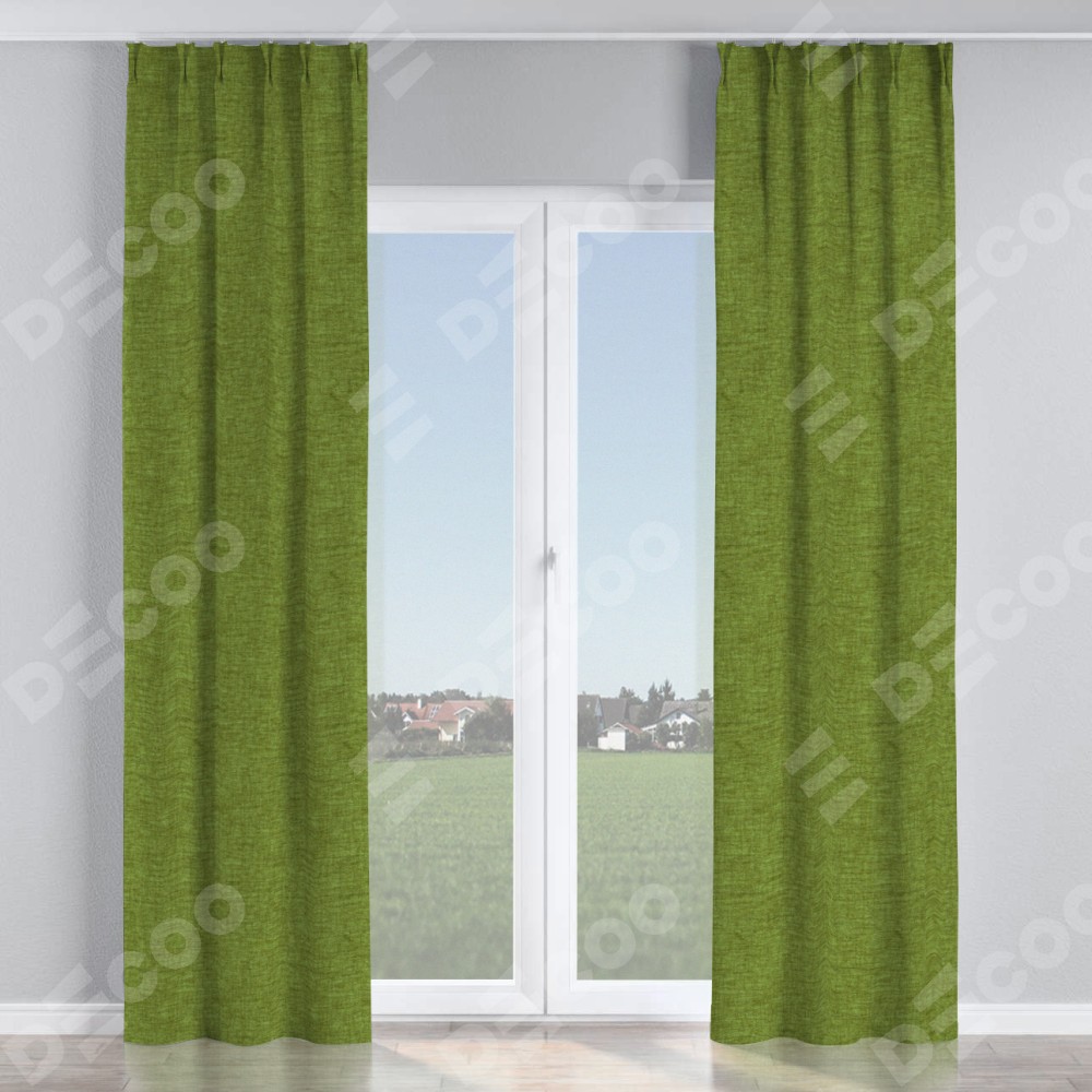 Комплект прямых штор, от производителя «Cortin», пошиты из ткани рогожка димаут салатовый, артикул ткани 80423. С изнаночной стороны в верхней части штор пристрачивается шторная лента с декоративными складками «Кустик». Для создания элегантных складок прямые шторы шьются по стандарту с коэффициентом 1:2 (на 100 см. ширины проёма 200 см. ширины ткани).