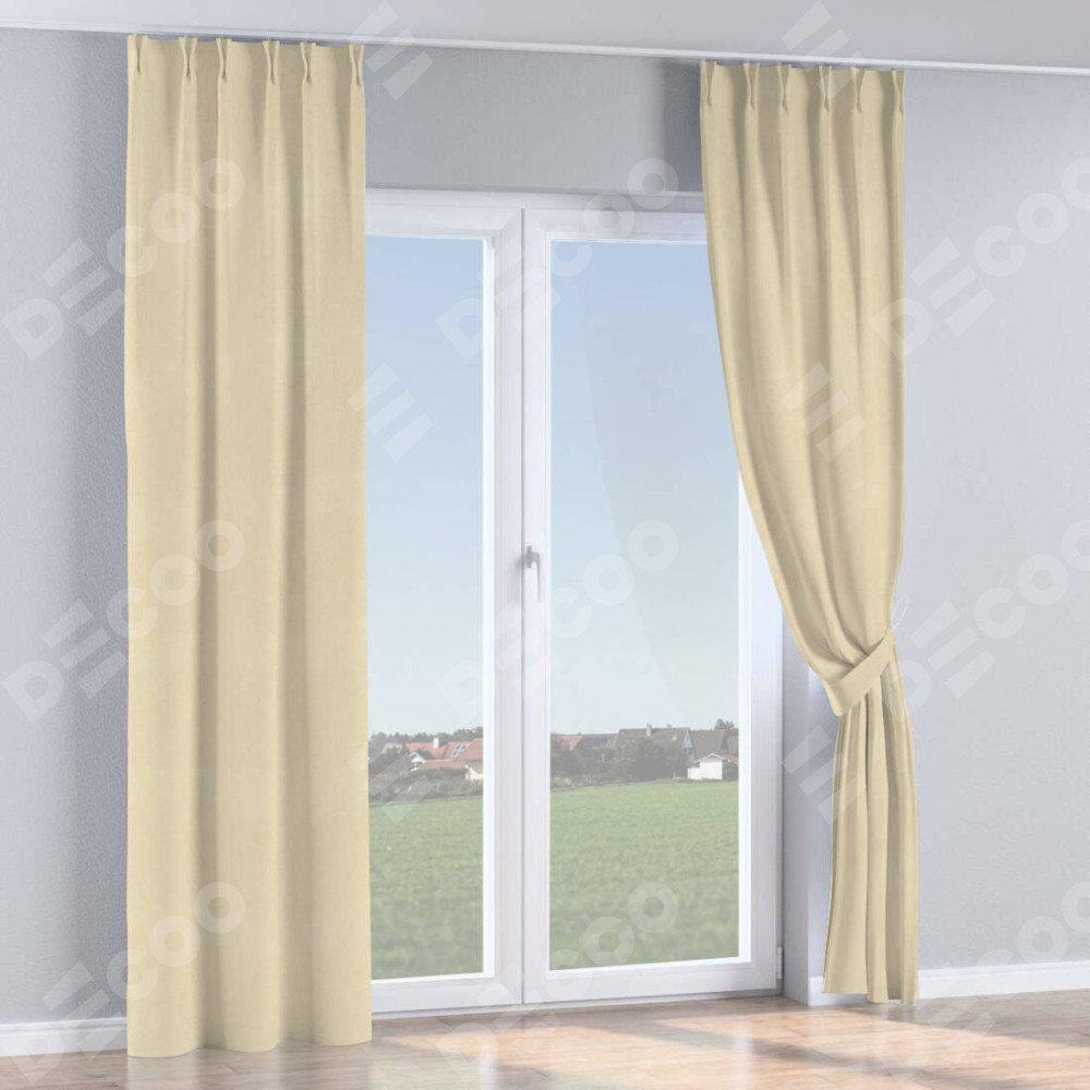 Комплект прямых штор, от производителя «Cortin», пошиты из ткани блэкаут однотонный бежевый, артикул ткани 13125. С изнаночной стороны в верхней части штор пристрачивается шторная лента с декоративными складками «Кустик». Для создания элегантных складок прямые шторы шьются по стандарту с коэффициентом 1:2 (на 100 см. ширины проёма 200 см. ширины ткани).