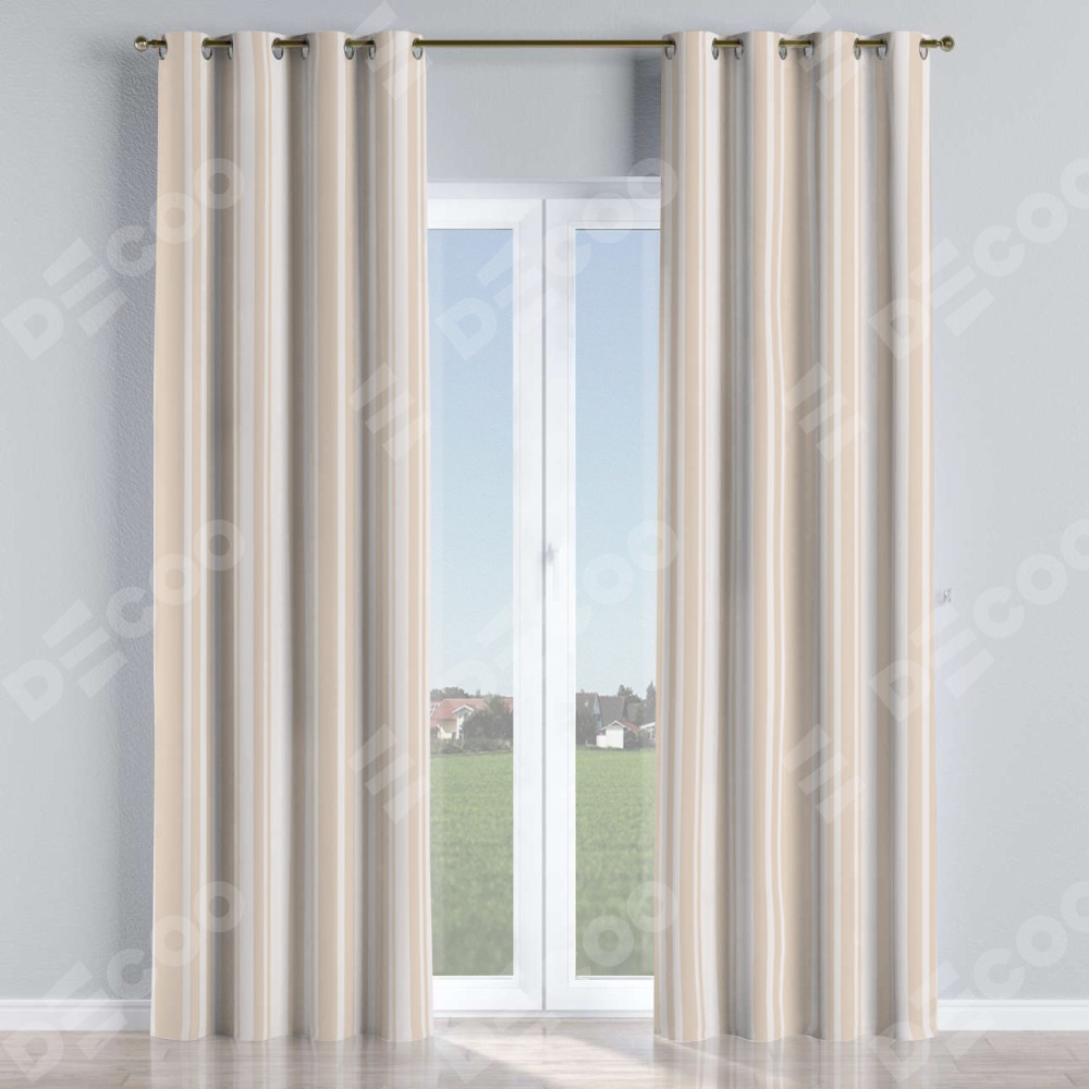 Комплект прямых штор, от производителя «Cortin», пошиты из ткани блэкаут с нанесением сублимационной печати «Бежевые вертикальные полоски». Данная модель пошита на люверсах, комплектуется на выбор круглым карнизом и подходит для монтажа на стену или потолок. Прямые шторы на люверсах шьются по стандарту с коэффициентом 1/2 (на 100 см. ширины проёма 200 см. ширины ткани), отличительным преимуществом данной модели является простой способ монтажа. Достаточно повесить ее на трубу и штора готова!
