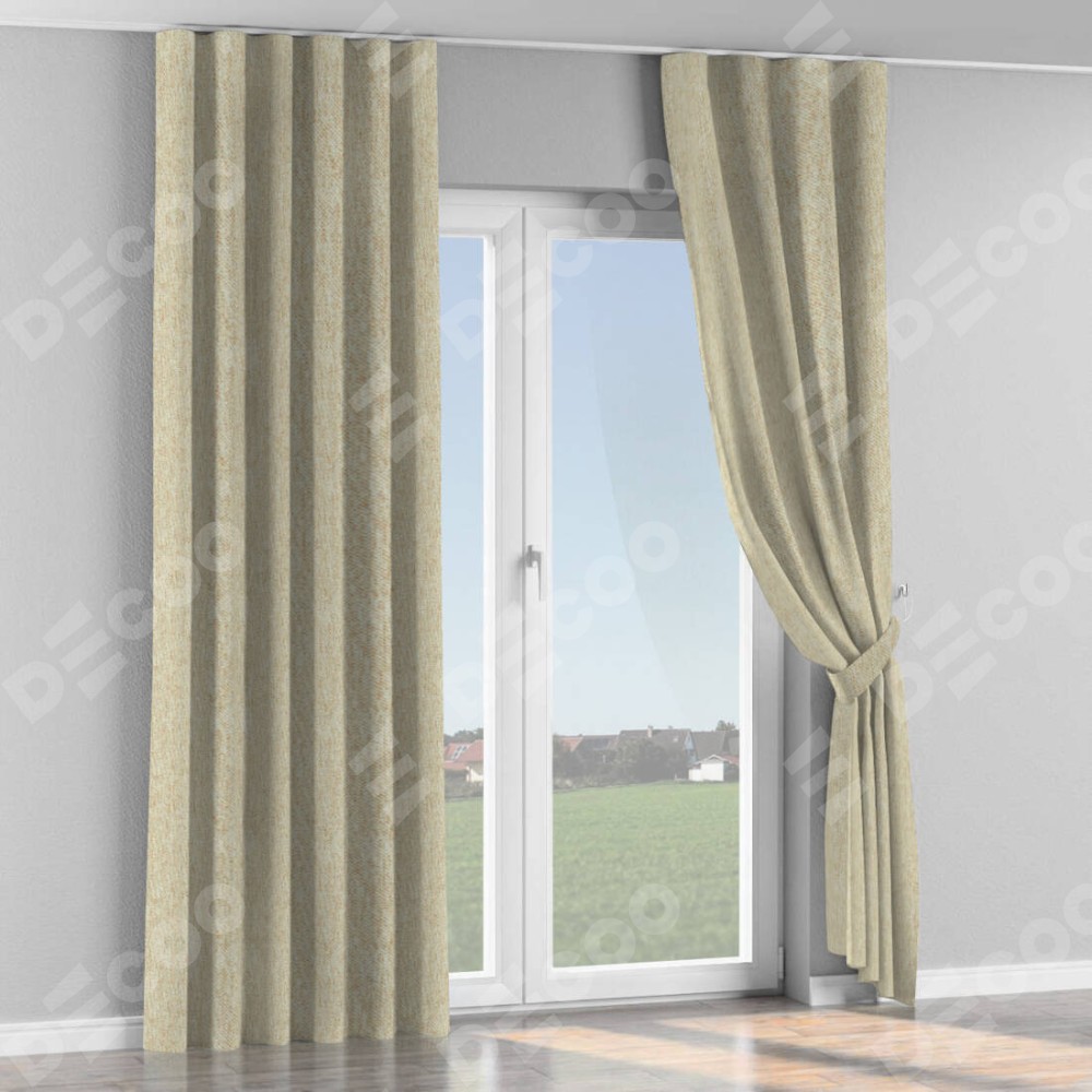 Комплект прямых штор, от производителя «Cortin», пошиты из ткани стиф димаут светло-бежевый, артикул ткани 18084. С изнаночной стороны в верхней части штор пристрачивается шторная лента с декоративными складками «Волна». Для создания элегантных складок прямые шторы шьются по стандарту с коэффициентом 1:2 (на 100 см. ширины проёма 200 см. ширины ткани).