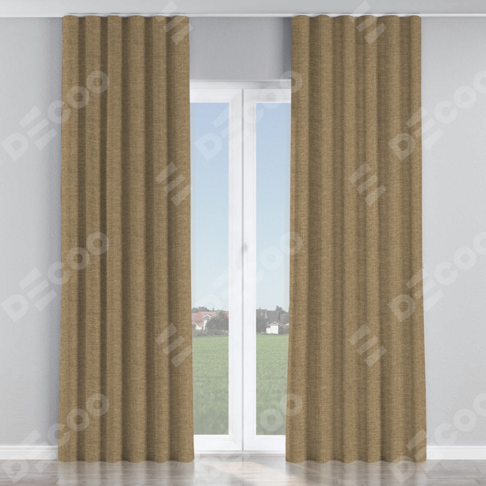 Комплект прямых штор, от производителя «Cortin», пошиты из ткани стиф димаут тёмно-бежевый, артикул ткани 18085. С изнаночной стороны в верхней части штор пристрачивается шторная лента с декоративными складками «Волна». Для создания элегантных складок прямые шторы шьются по стандарту с коэффициентом 1:2 (на 100 см. ширины проёма 200 см. ширины ткани).