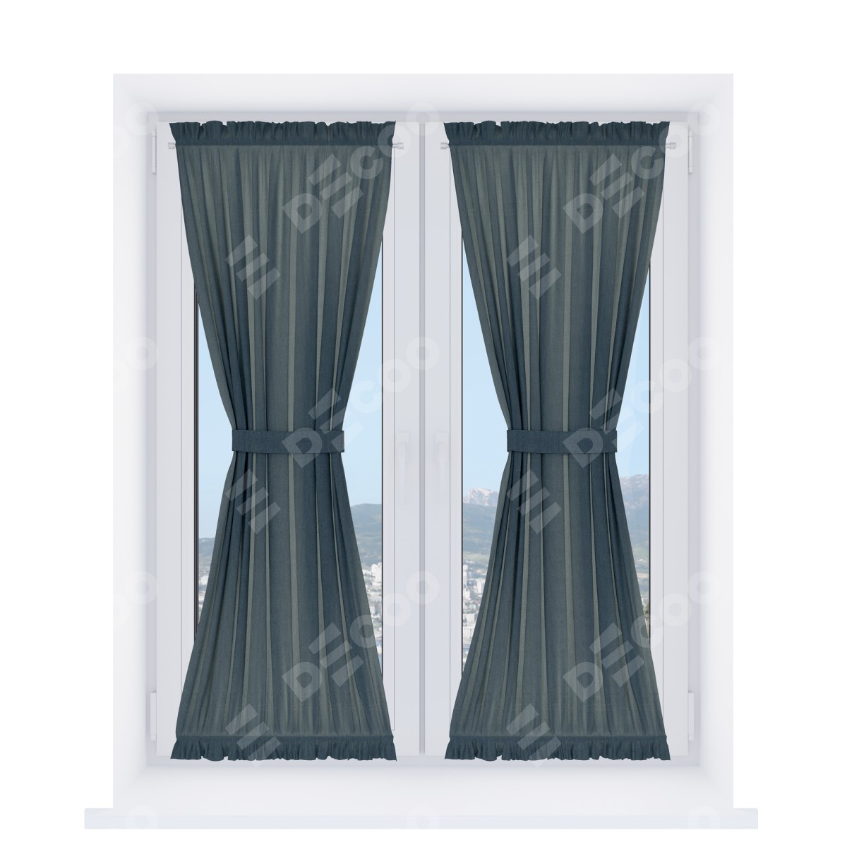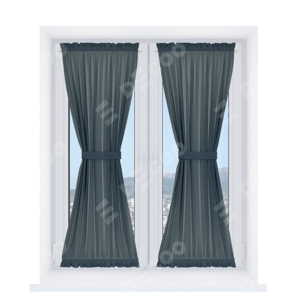 Штора «Песочные часы» производителя «Cortin», используется для створок окон и дверей, пошита из ткани лён димаут серо-синий, артикул ткани 03238.