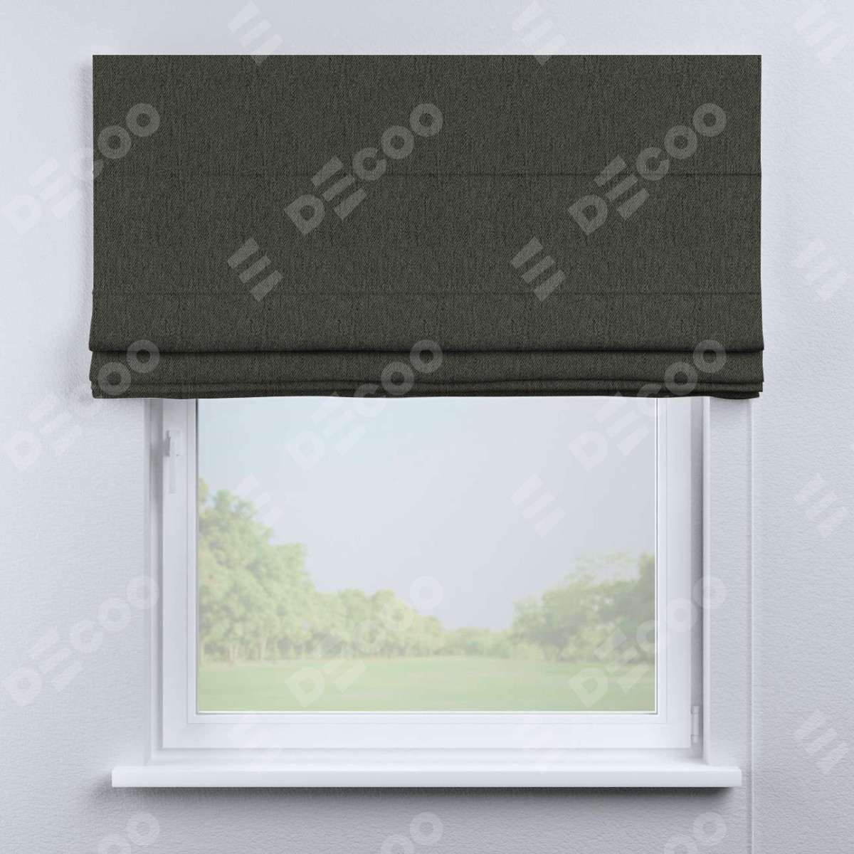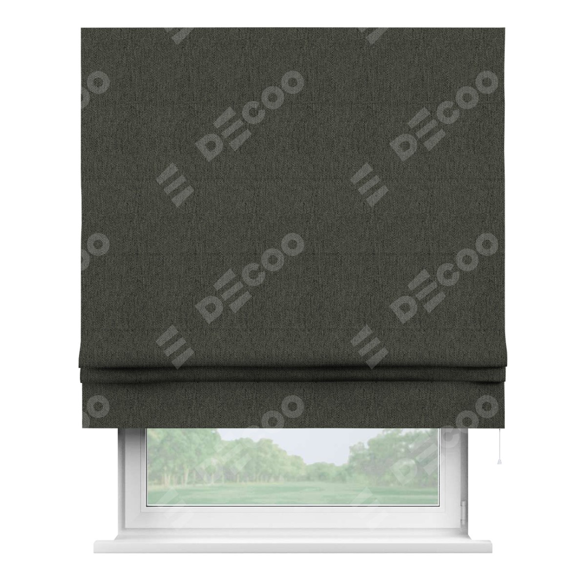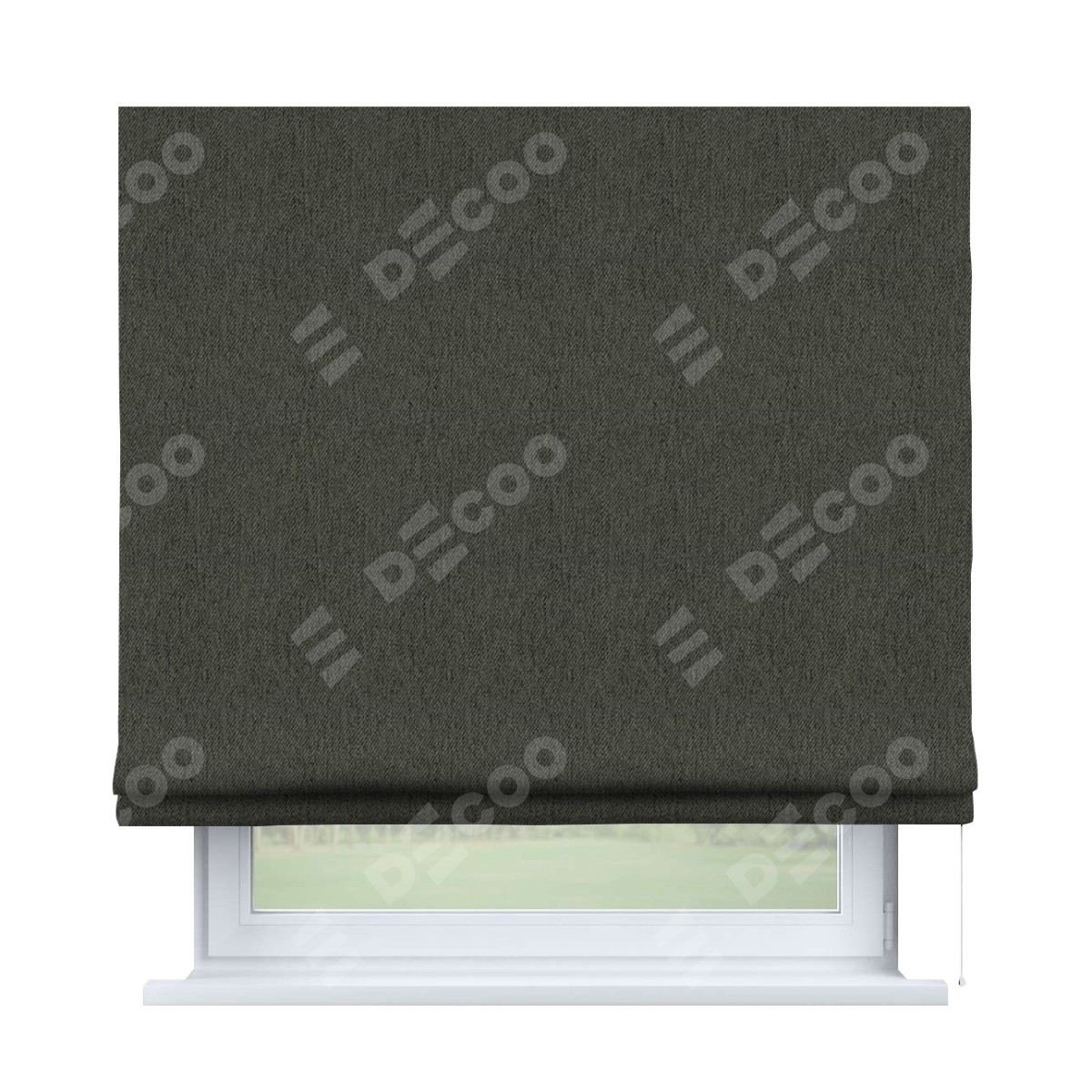 Римская штора производителя «Cortin», используется для проёма, пошита из ткани твид блэкаут тёмно-серый, артикул ткани 21587. Имеет универсальный механизм и подходит для монтажа: на потолок, на стену и в нишу.