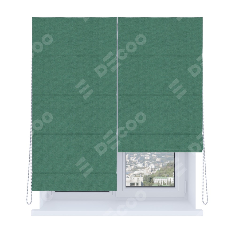 Римская штора производителя «Cortin», используется для проёма, пошита из ткани блэкаут тиснение с блеском изумрудный, артикул ткани 34628. Изнаночная сторона материала черного цвета, что обеспечивает необходимую светонепроницаемость. Имеет универсальный механизм и подходит для монтажа: на потолок, на стену и в нишу. Удобное управление каждой шторой отдельно.