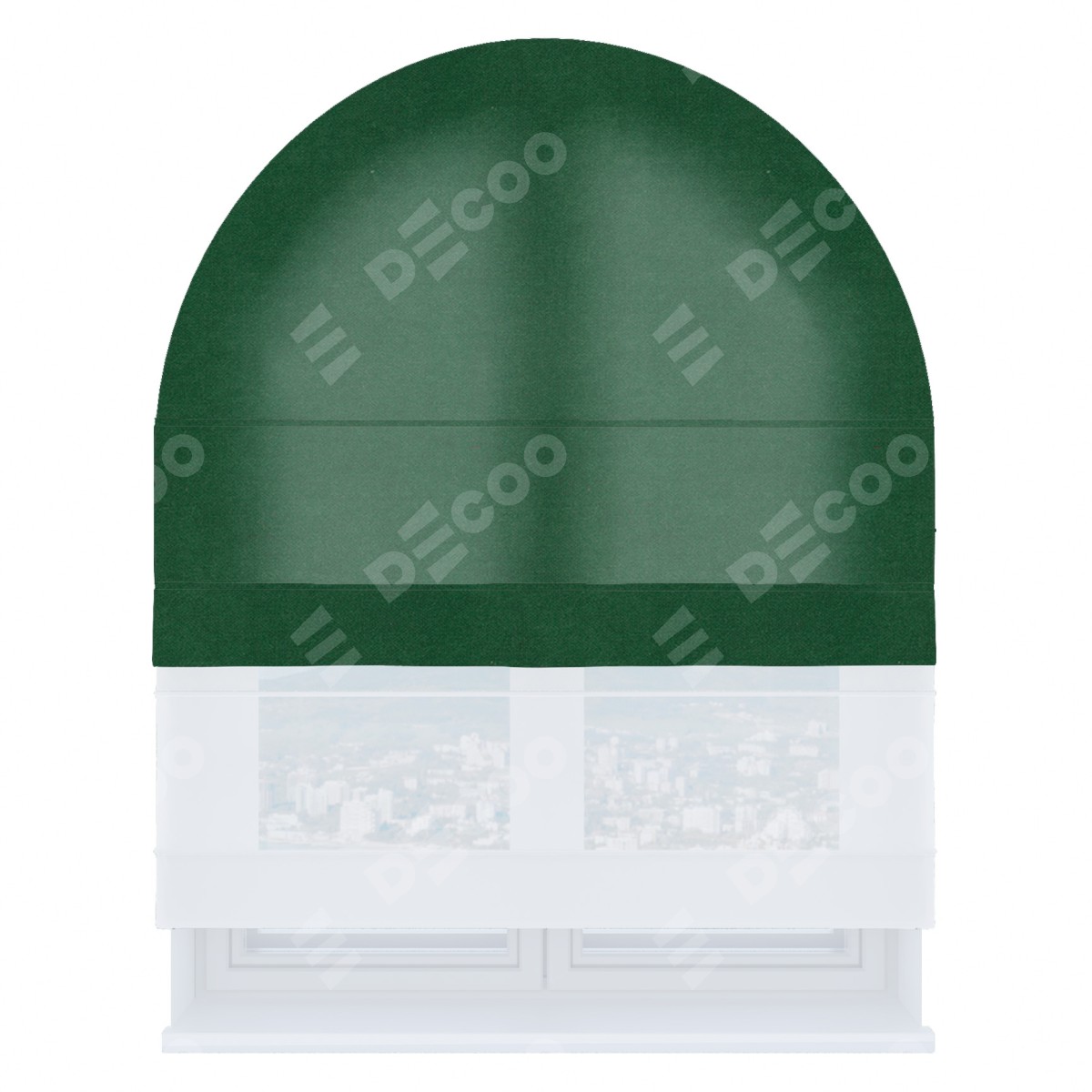 Римская штора день-ночь производителя «Cortin», используется для арочного проёма, пошита из двух полотен, с лицевой стороны вельвет зелёный артикул 85546, вторая ткань тюль (по стандарту комплектуется тюль белого цвета артикул V-01). Штора шьётся по индивидуальным размерам, для данного типа римской шторы возможная ширина от 60 до 300 см. Удобное управление каждой шторой отдельно.