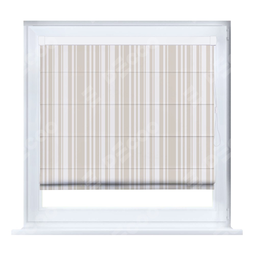 Римская штора производителя «Cortin», устанавливается на створку окна, пошита из ткани блэкаут с нанесением сублимационной печати «Бежевые вертикальные полоски». Штора шьётся по индивидуальным размерам, для данного типа римской шторы возможная ширина от 35 до 150 см., высота до 250 см.