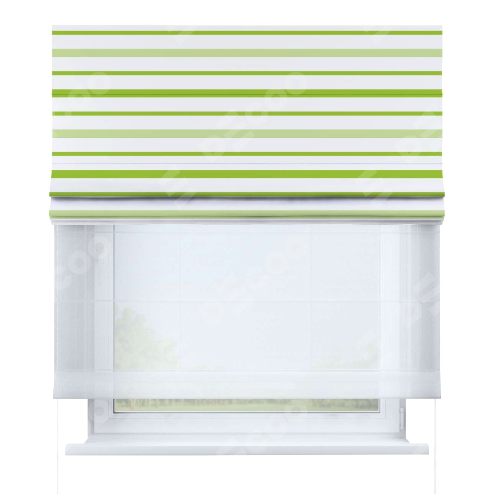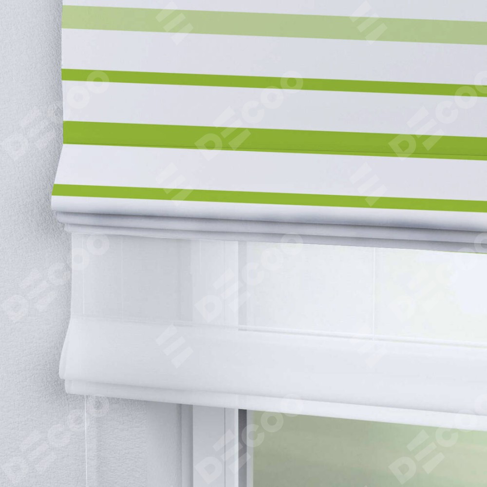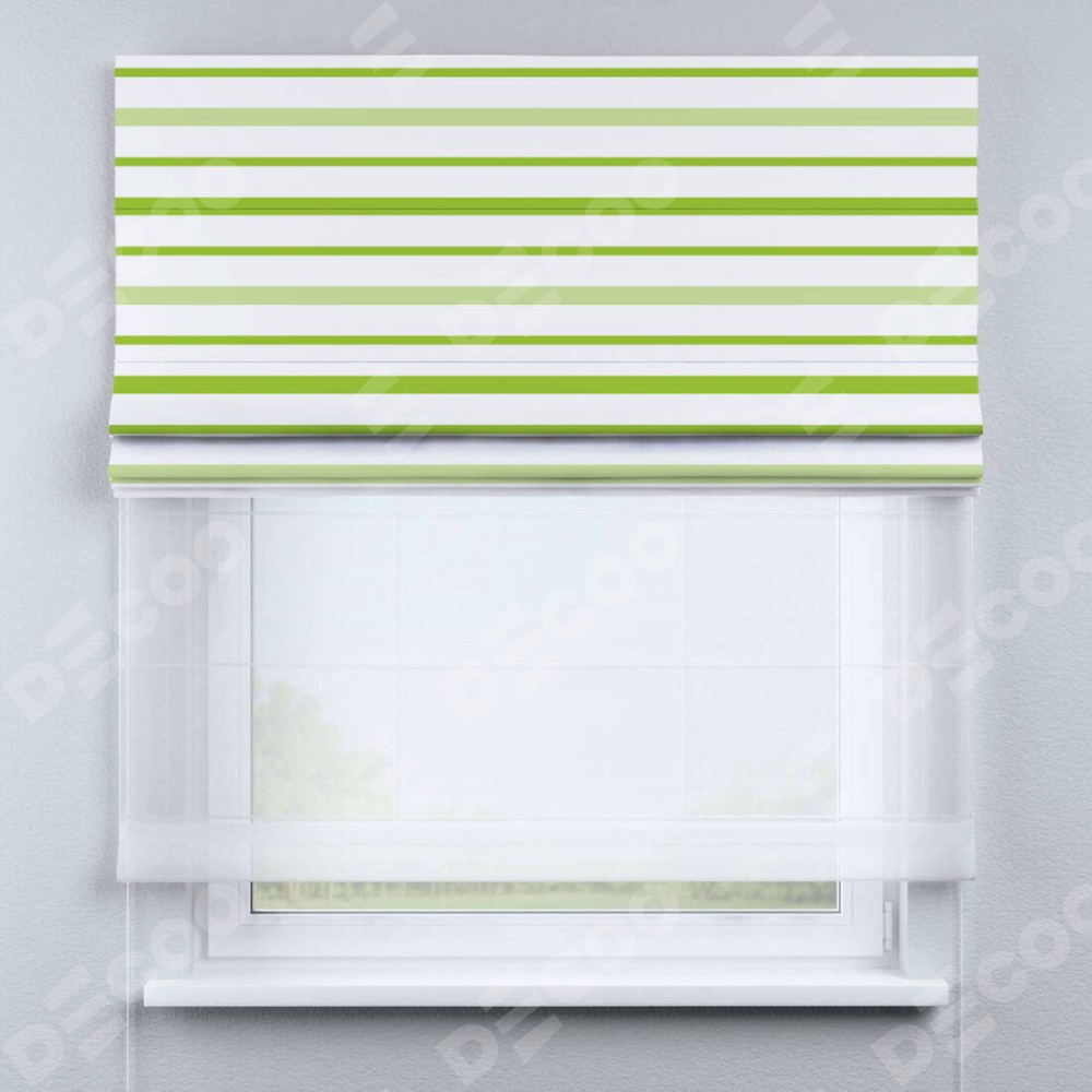 Римская штора день-ночь производителя «Cortin», используется для проёма, пошита из двух полотен, с лицевой блэкаут с нанесением сублимационной печати «Зелёные горизонтальные полоски», вторая ткань тюль (по стандарту комплектуется тюль белого цвета артикул V-01). Имеет универсальный механизм и подходит для монтажа: на потолок, на стену и в нишу.