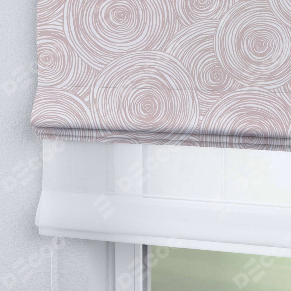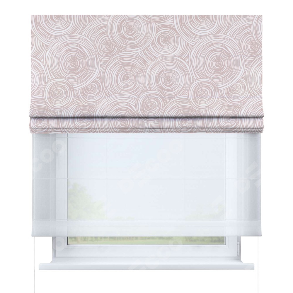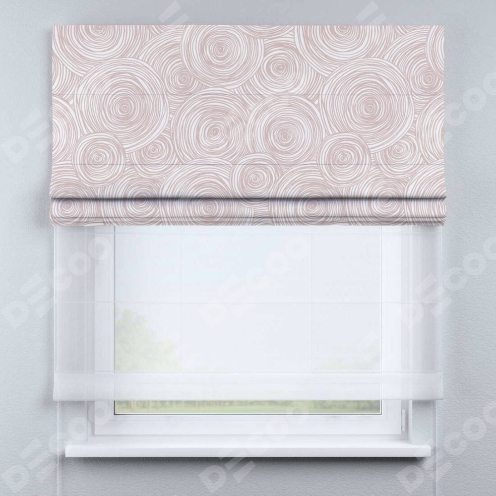 Римская штора день-ночь производителя «Cortin», используется для проёма, пошита из двух полотен, с лицевой блэкаут с нанесением сублимационной печати «Бежевые круги», вторая ткань тюль (по стандарту комплектуется тюль белого цвета артикул V-01). Имеет универсальный механизм и подходит для монтажа: на потолок, на стену и в нишу.