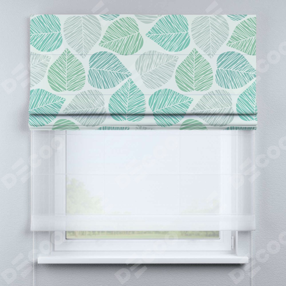 Римская штора день-ночь производителя «Cortin», используется для проёма, пошита из двух полотен, с лицевой блэкаут с нанесением сублимационной печати «Весенняя листва», вторая ткань тюль (по стандарту комплектуется тюль белого цвета артикул V-01). Имеет универсальный механизм и подходит для монтажа: на потолок, на стену и в нишу.