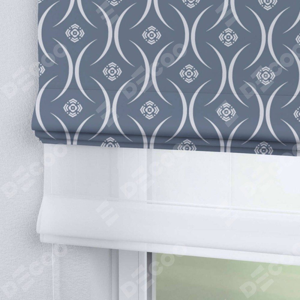 Римская штора день-ночь производителя «Cortin», используется для проёма, пошита из двух полотен, с лицевой блэкаут с нанесением сублимационной печати «Воздушный узор серый», вторая ткань тюль (по стандарту комплектуется тюль белого цвета артикул V-01). Имеет универсальный механизм и подходит для монтажа: на потолок, на стену и в нишу.