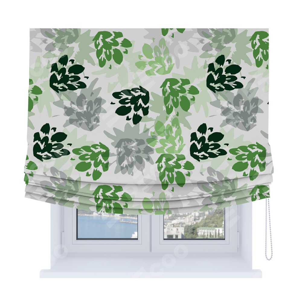 Римская штора Soft производителя «Cortin», используется для проёма, пошита из ткани блэкаут с нанесением сублимационной печати «Зелёный луг». Имеет универсальный механизм и подходит для монтажа: на потолок, на стену и в нишу. В отличие от стандартных римских штор, римская штора Soft не имеет горизонтальных вставок и нижнего отвеса. Это позволяет ткани произвольно драпироваться в свободные мягкие складки.