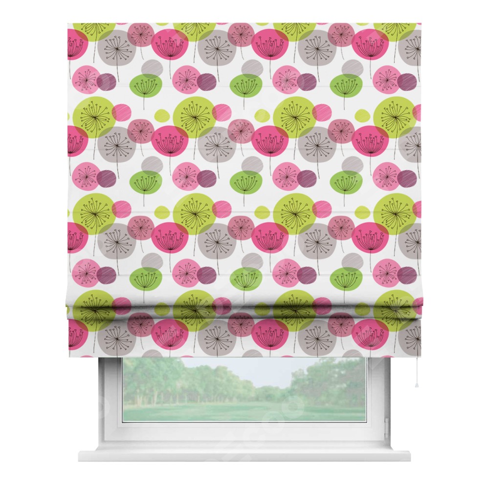 Римская штора производителя «Cortin», используется для проёма, пошита из ткани блэкаут с нанесением сублимационной печати «Цветные одуванчики». Имеет универсальный механизм и подходит для монтажа: на потолок, на стену и в нишу.