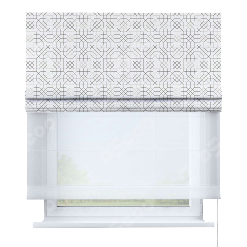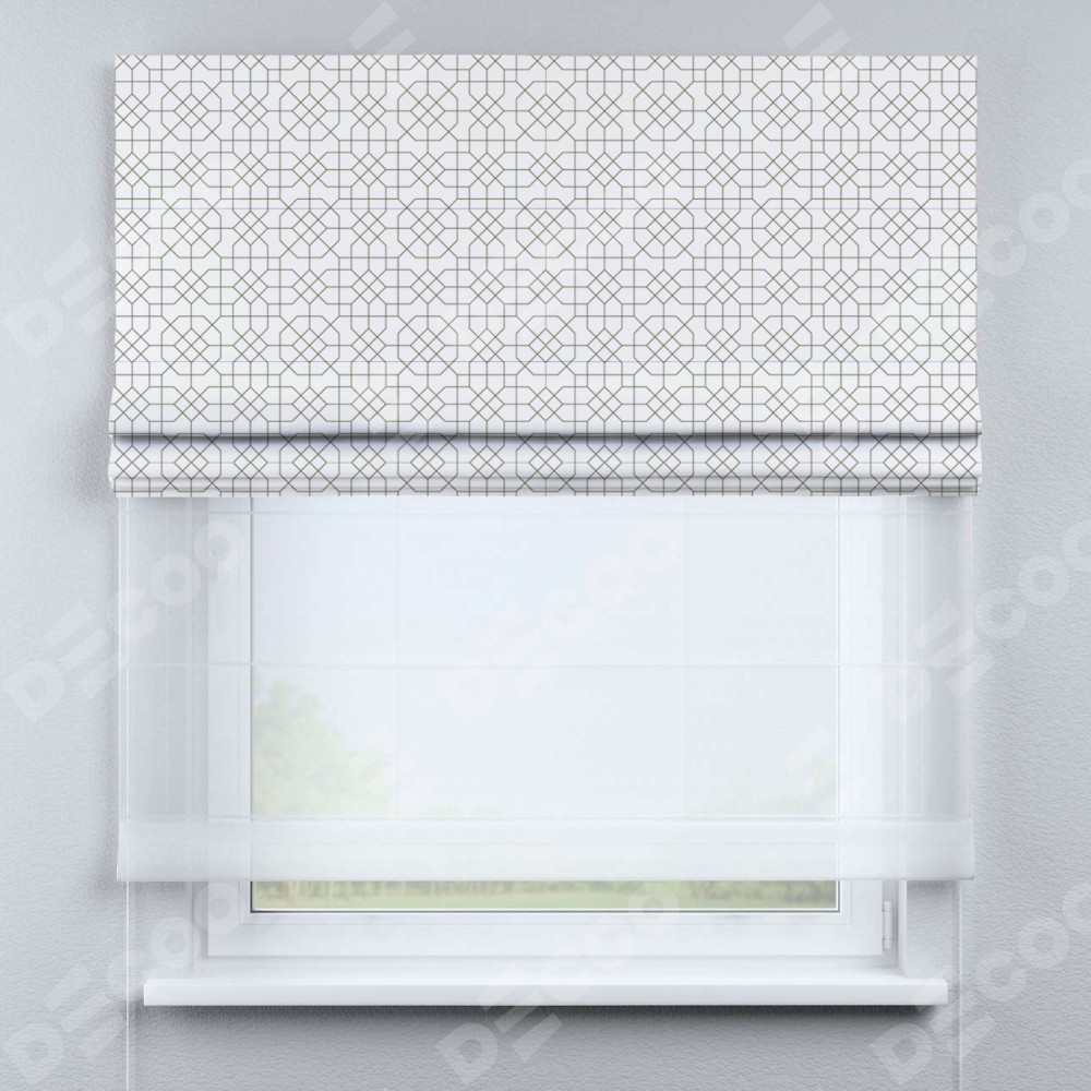Римская штора день-ночь производителя «Cortin», используется для проёма, пошита из двух полотен, с лицевой блэкаут с нанесением сублимационной печати «Орнамент из тонких линий», вторая ткань тюль (по стандарту комплектуется тюль белого цвета артикул V-01). Имеет универсальный механизм и подходит для монтажа: на потолок, на стену и в нишу.