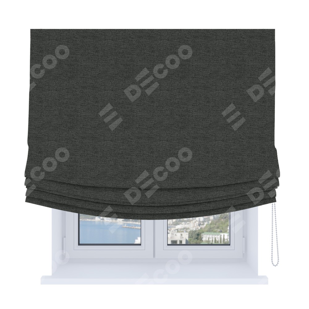 Римская штора Soft производителя «Cortin», используется для проёма, пошита из ткани стиф димаут графит, артикул ткани 44026. Имеет универсальный механизм и подходит для монтажа: на потолок, на стену и в нишу. В отличие от стандартных римских штор, римская штора Soft не имеет горизонтальных вставок и нижнего отвеса. Это позволяет ткани произвольно драпироваться в свободные мягкие складки.