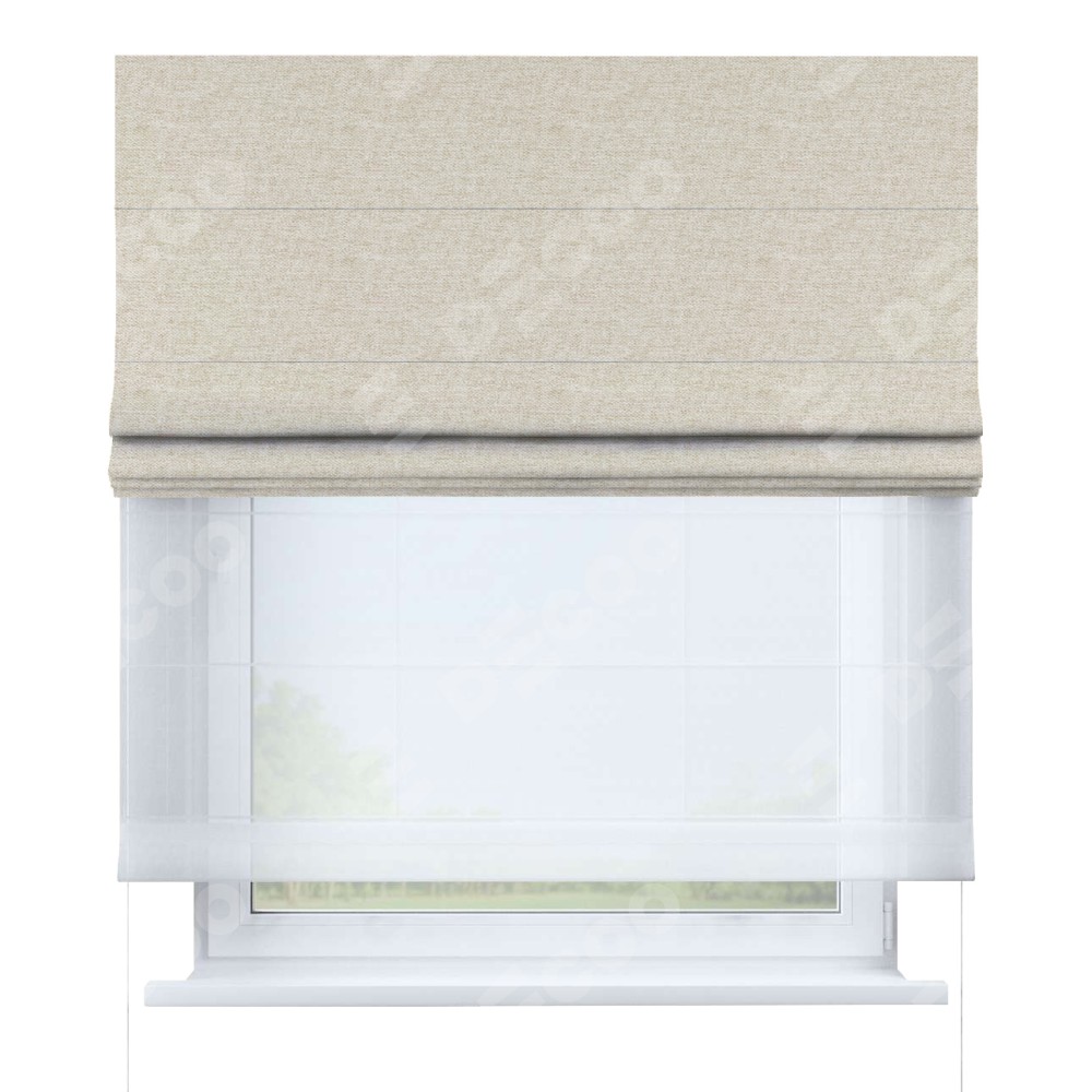 Римская штора день-ночь производителя «Cortin», используется для проёма, пошита из двух полотен, с лицевой стороны стиф димаут молочный артикул 18082, вторая ткань тюль (по стандарту комплектуется тюль белого цвета артикул V-01). Имеет универсальный механизм и подходит для монтажа: на потолок, на стену и в нишу.