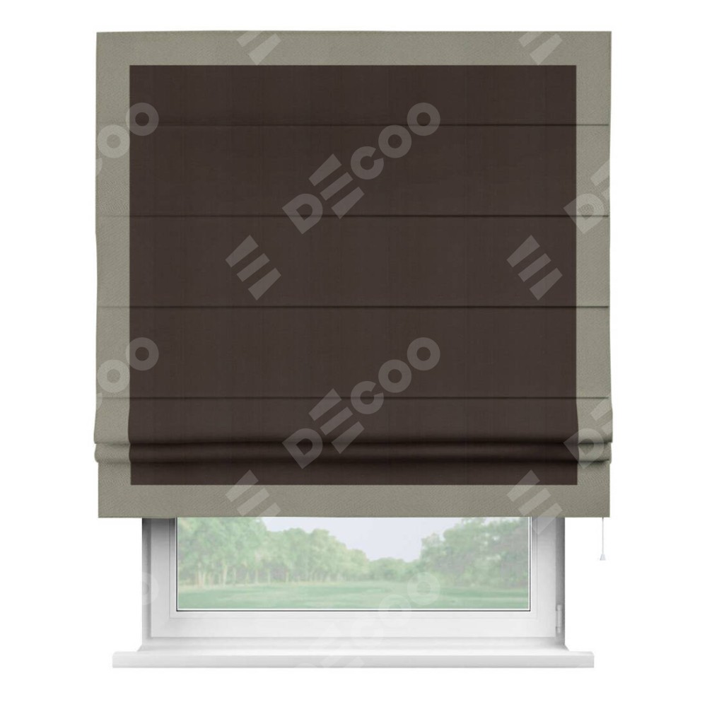 Римская штора производителя «Cortin», используется для проёма, пошита из ткани блэкаут однотонный венге, артикул ткани 88286. Отделка шторы кантом «Чесс», ткань для канта используется из блэкаута однотонного разной расцветки на выбор. Имеет универсальный механизм и подходит для монтажа: на потолок, на стену и в нишу.