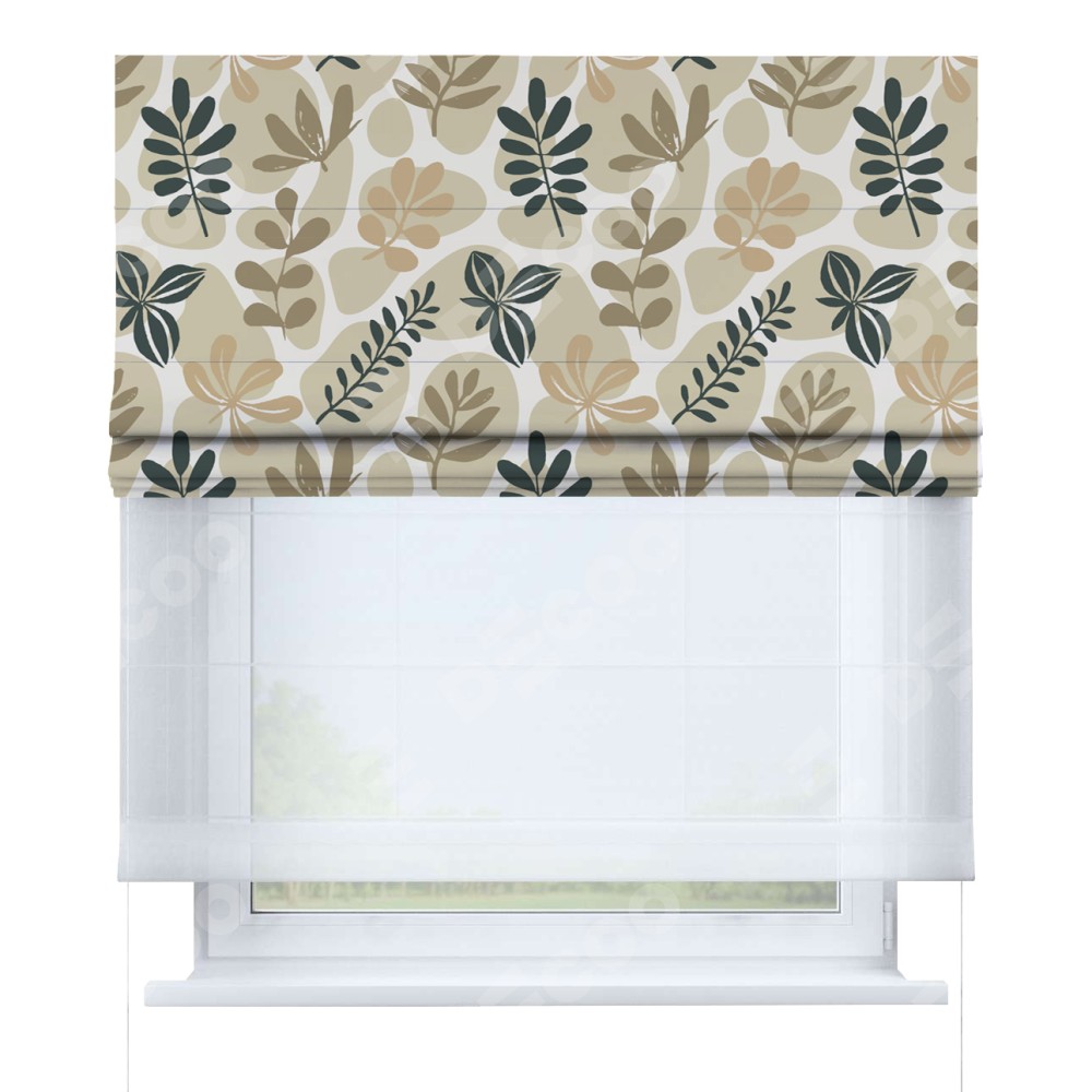 Римская штора день-ночь производителя «Cortin», используется для проёма, пошита из двух полотен, с лицевой блэкаут с нанесением сублимационной печати «Бежевый сад», вторая ткань тюль (по стандарту комплектуется тюль белого цвета артикул V-01). Имеет универсальный механизм и подходит для монтажа: на потолок, на стену и в нишу.