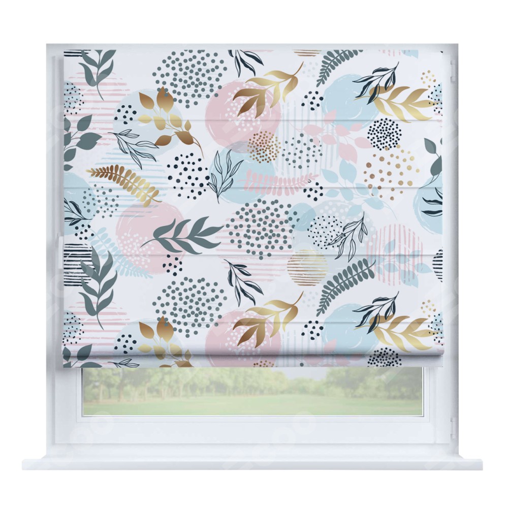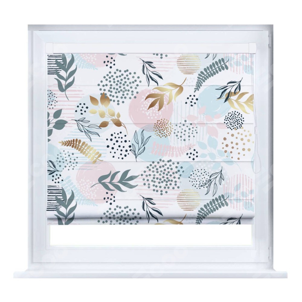 Римская штора производителя «Cortin», устанавливается на створку окна, пошита из ткани блэкаут с нанесением сублимационной печати «Точки и листочки». Штора шьётся по индивидуальным размерам, для данного типа римской шторы возможная ширина от 35 до 150 см., высота до 250 см.