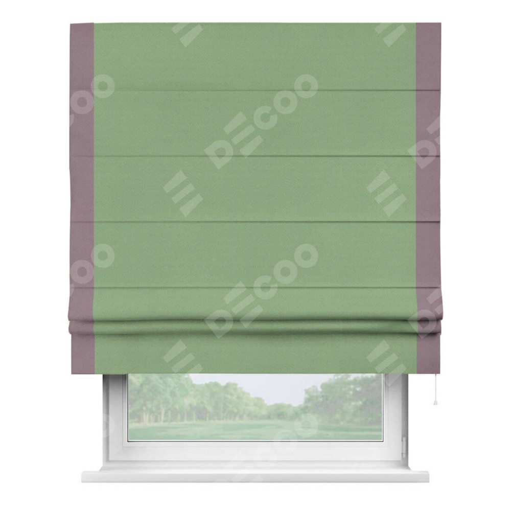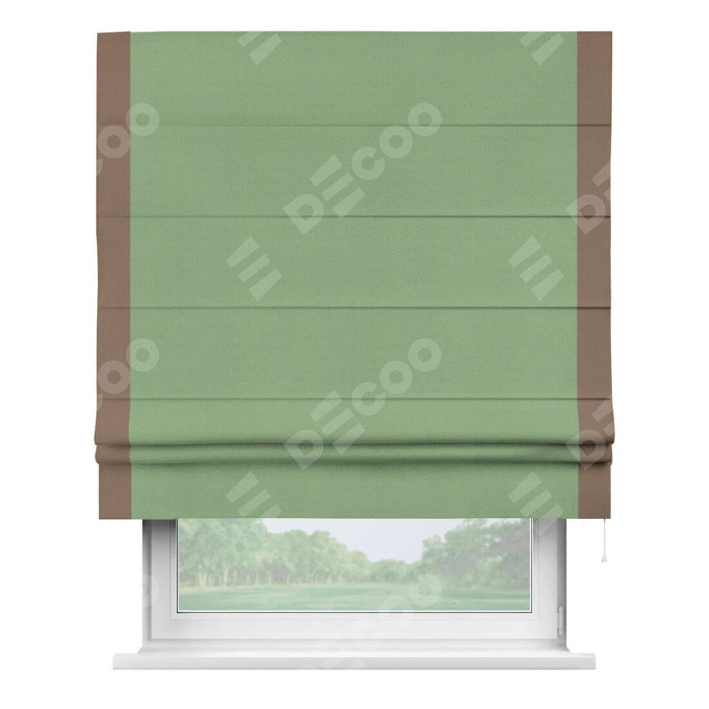 Римская штора производителя «Cortin», используется для проёма, пошита из ткани блэкаут однотонный оливковый, артикул ткани 88300. Отделка шторы кантом «Стрим Дуо», ткань для канта используется из блэкаута однотонного разной расцветки на выбор. Имеет универсальный механизм и подходит для монтажа: на потолок, на стену и в нишу.