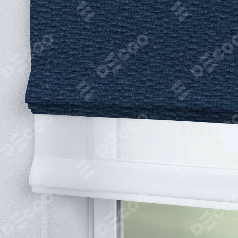 Римская штора день-ночь производителя «Cortin», используется для проёма, пошита из двух полотен, с лицевой стороны лён кашемир тёмно-синий артикул 17215, вторая ткань тюль (по стандарту комплектуется тюль белого цвета артикул V-01). Имеет универсальный механизм и подходит для монтажа: на потолок, на стену и в нишу.