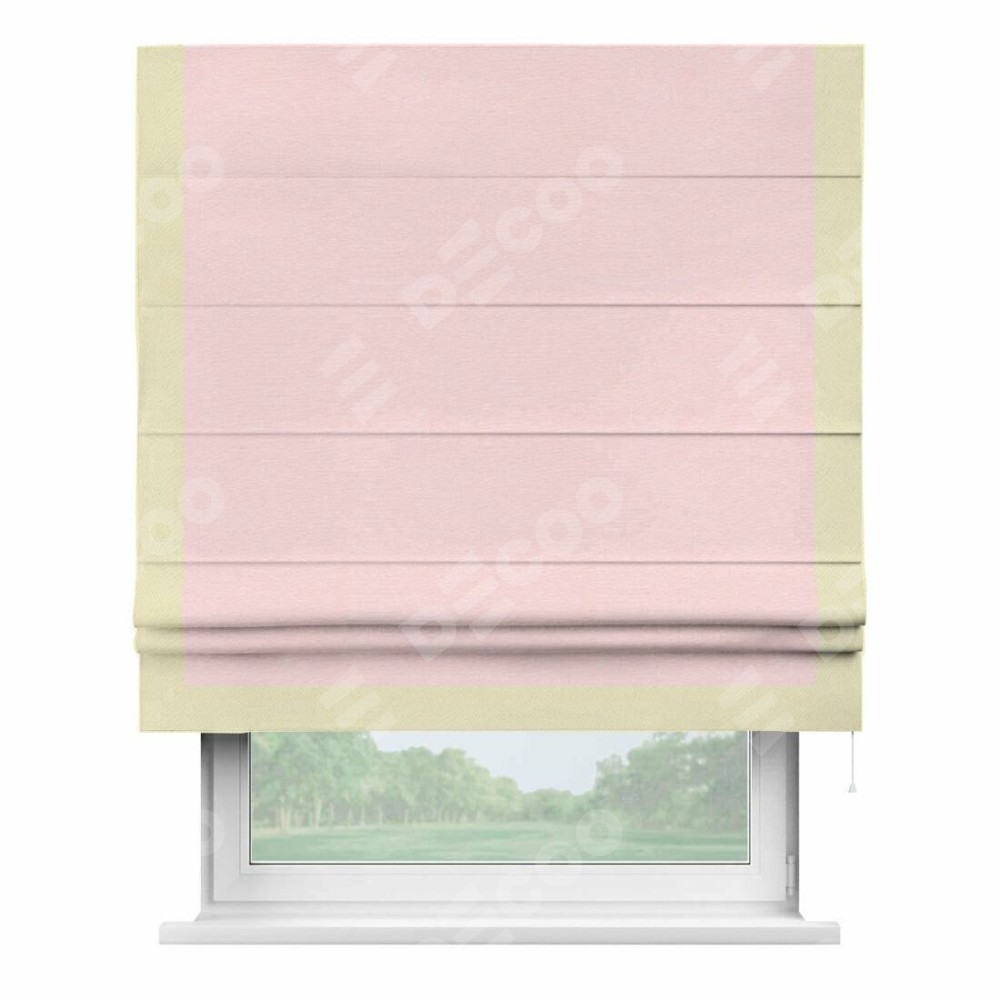 Римская штора производителя «Cortin», используется для проёма, пошита из ткани блэкаут однотонный розовый, артикул ткани 83046. Отделка шторы кантом «Виктория», ткань для канта используется из блэкаута однотонного разной расцветки на выбор. Имеет универсальный механизм и подходит для монтажа: на потолок, на стену и в нишу.