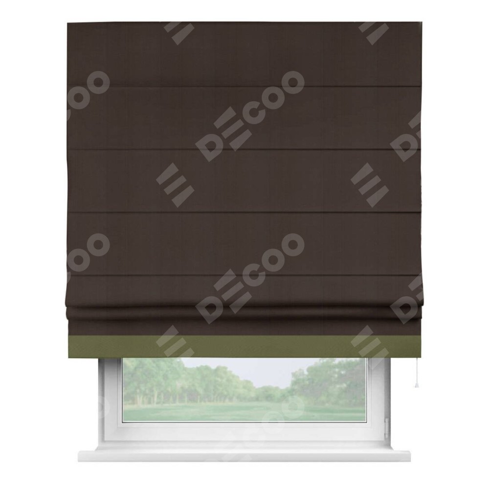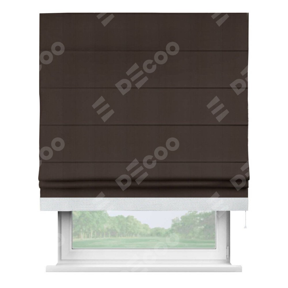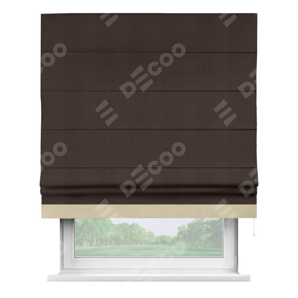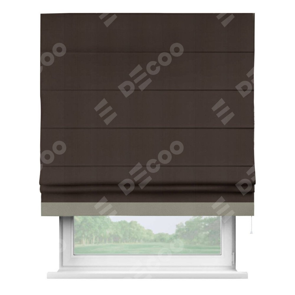 Римская штора производителя «Cortin», используется для проёма, пошита из ткани блэкаут однотонный тёмно-коричневый, артикул ткани 88287. Отделка шторы кантом «Джестер», ткань для канта используется из блэкаута однотонного разной расцветки на выбор. Имеет универсальный механизм и подходит для монтажа: на потолок, на стену и в нишу.
