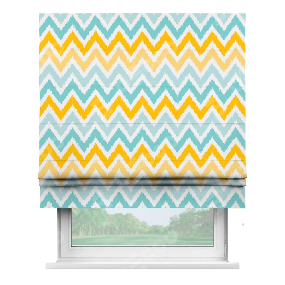 Римская штора производителя «Cortin», используется для проёма, пошита из ткани блэкаут с нанесением сублимационной печати «Икат шеврон». Имеет универсальный механизм и подходит для монтажа: на потолок, на стену и в нишу.