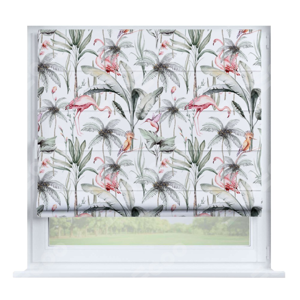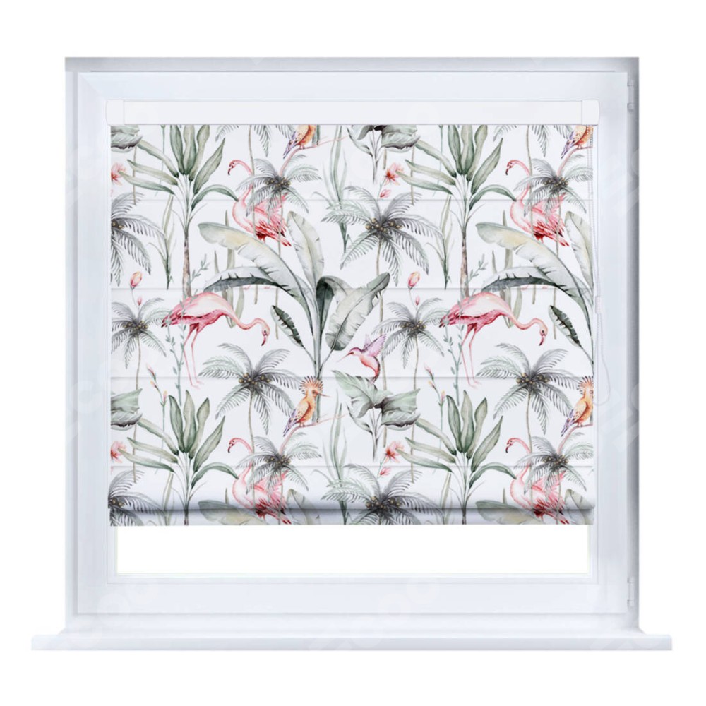 Римская штора «Кортин» на створку «Изящные фламинго» отлично подойдёт для интерьера: на балкон, в кухню и в гостиную.