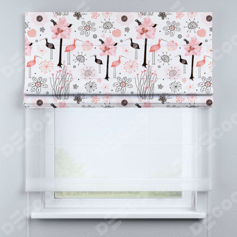 Римская штора день-ночь производителя «Cortin», используется для проёма, пошита из двух полотен, с лицевой блэкаут с нанесением сублимационной печати «Любопытные птички», вторая ткань тюль (по стандарту комплектуется тюль белого цвета артикул V-01). Имеет универсальный механизм и подходит для монтажа: на потолок, на стену и в нишу.