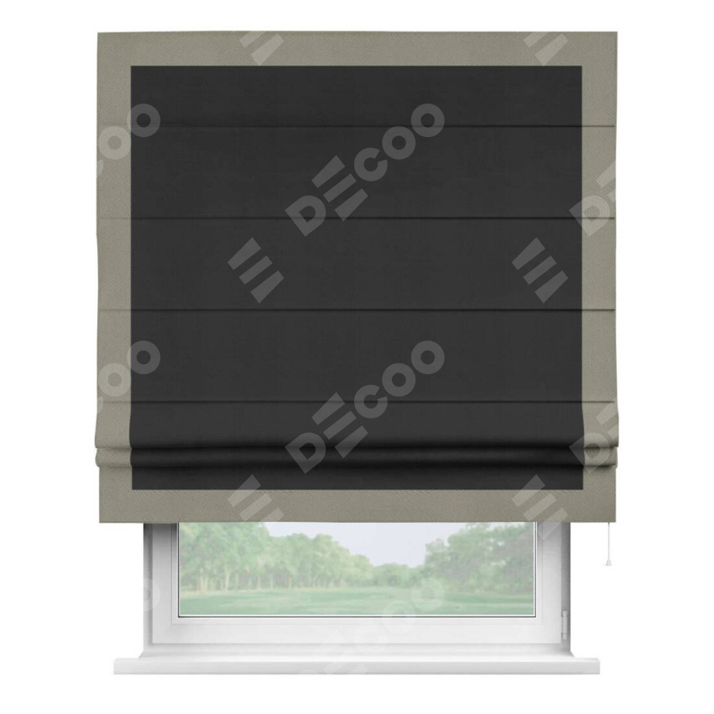Римская штора производителя «Cortin», используется для проёма, пошита из ткани блэкаут однотонный черный, артикул ткани 79904. Отделка шторы кантом «Чесс», ткань для канта используется из блэкаута однотонного разной расцветки на выбор. Имеет универсальный механизм и подходит для монтажа: на потолок, на стену и в нишу.