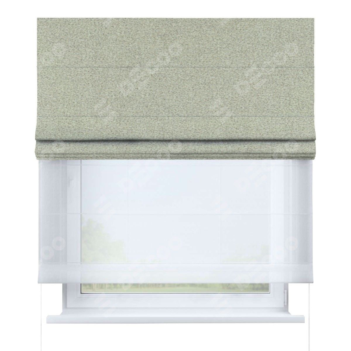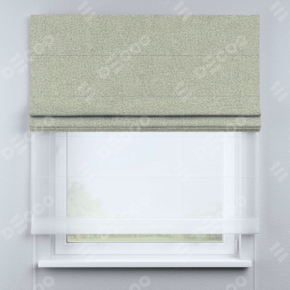 Римская штора день-ночь производителя «Cortin», используется для проёма, пошита из двух полотен, с лицевой стороны лён блэкаут серо-бежевый артикул 69450, вторая ткань тюль (по стандарту комплектуется тюль белого цвета артикул V-01). Имеет универсальный механизм и подходит для монтажа: на потолок, на стену и в нишу.
