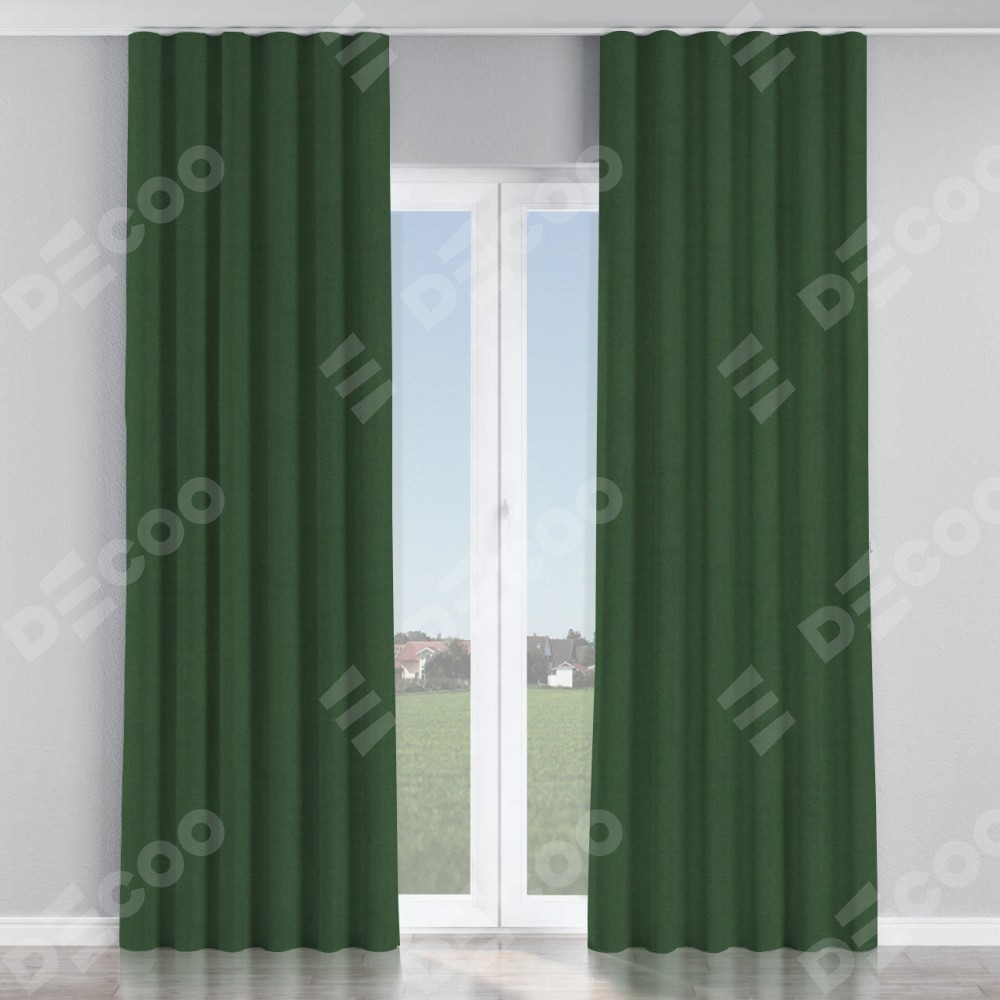 Комплект прямых штор, от производителя «Cortin», пошиты из ткани лён блэкаут зелёный, артикул ткани 69497. С изнаночной стороны в верхней части штор пристрачивается шторная лента с декоративными складками «Волна». Для создания элегантных складок прямые шторы шьются по стандарту с коэффициентом 1:2 (на 100 см. ширины проёма 200 см. ширины ткани).