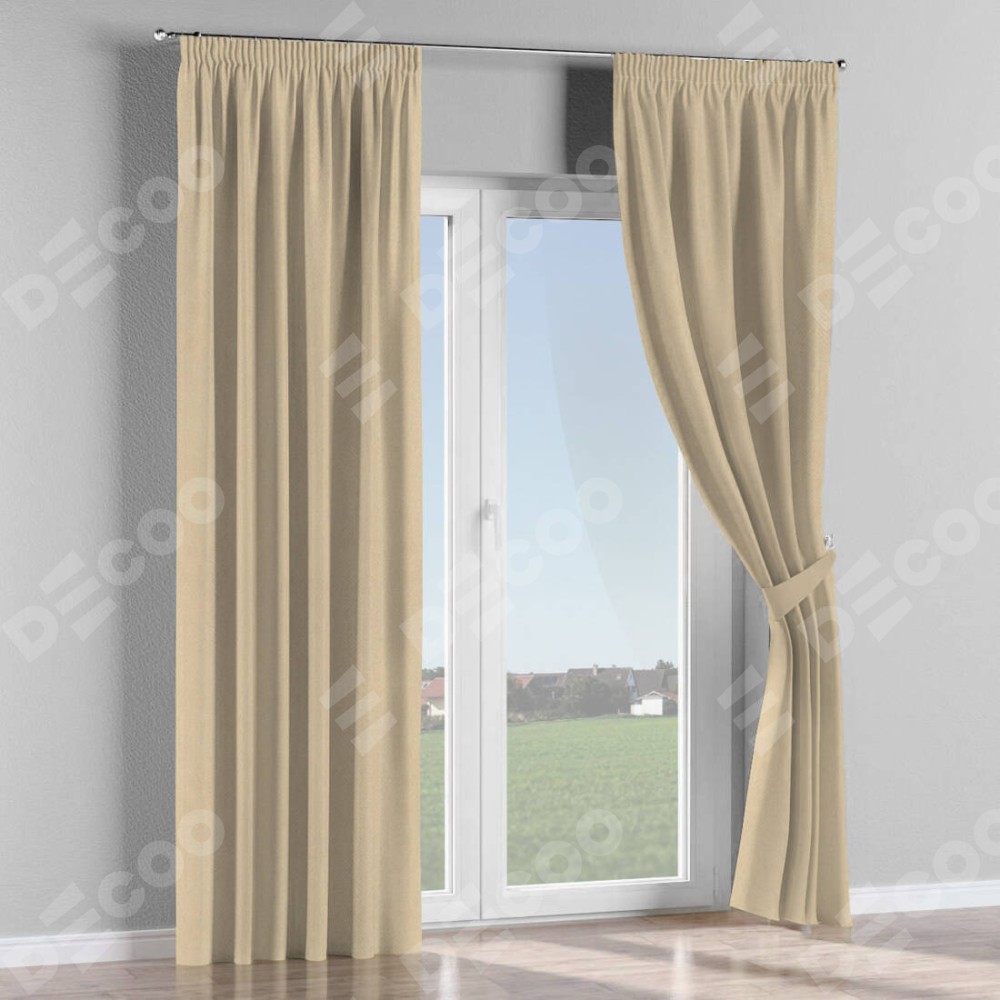 Комплект прямых штор, от производителя «Cortin», пошиты из ткани блэкаут однотонный кофейно-бежевый, артикул ткани 12095−1. С изнаночной стороны в верхней части штор пристрачивается шторная лента с декоративными складками «Карандаш». Для создания элегантных складок прямые шторы шьются по стандарту с коэффициентом 1:2 (на 100 см. ширины проёма 200 см. ширины ткани).