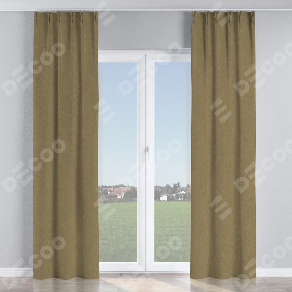 Комплект прямых штор, от производителя «Cortin», пошиты из ткани блэкаут однотонный бежево-золотой, артикул ткани 12095−2. С изнаночной стороны в верхней части штор пристрачивается шторная лента с декоративными складками «Кустик». Для создания элегантных складок прямые шторы шьются по стандарту с коэффициентом 1:2 (на 100 см. ширины проёма 200 см. ширины ткани).