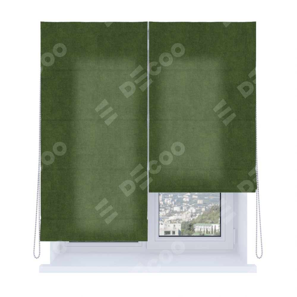 Римская штора производителя «Cortin», используется для проёма, пошита из ткани вельвет тёмно-салатовый, артикул ткани 33805. Имеет универсальный механизм и подходит для монтажа: на потолок, на стену и в нишу. Удобное управление каждой шторой отдельно.