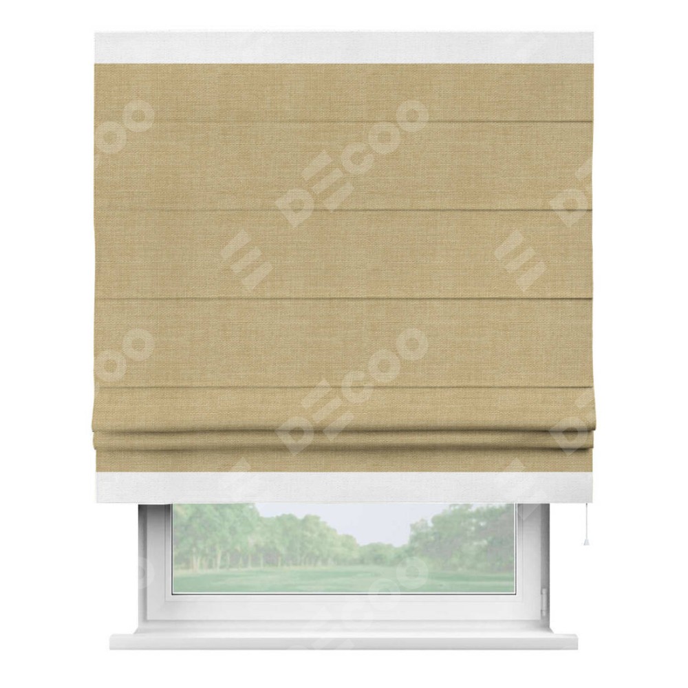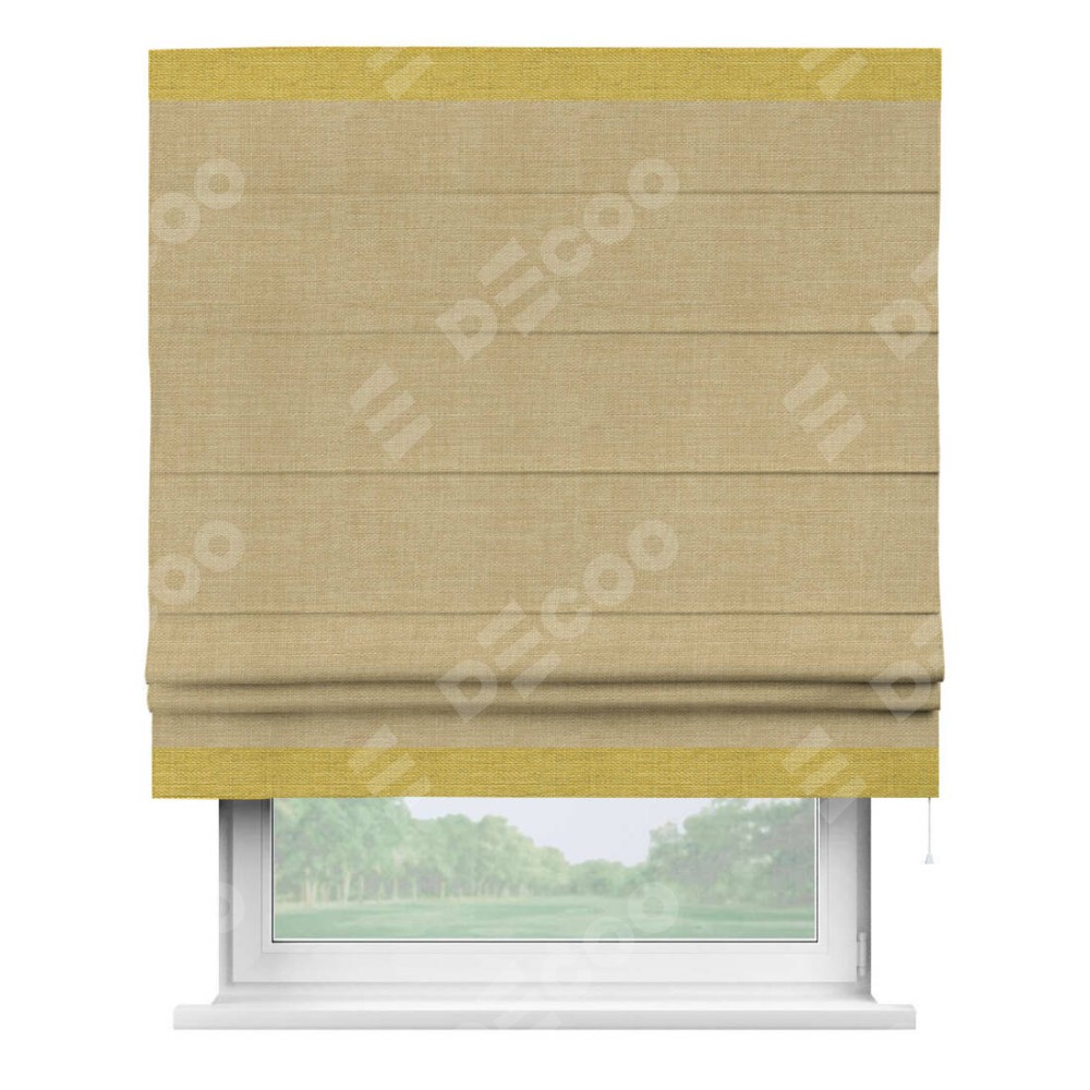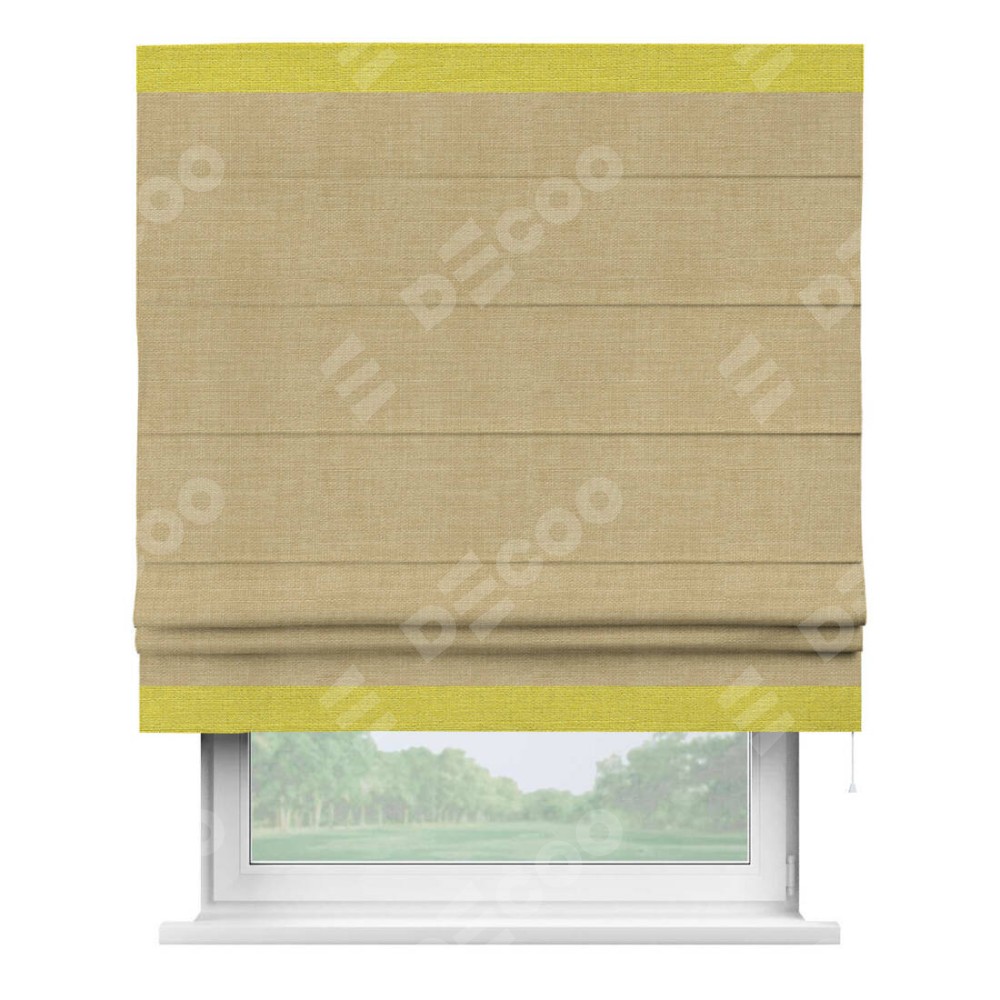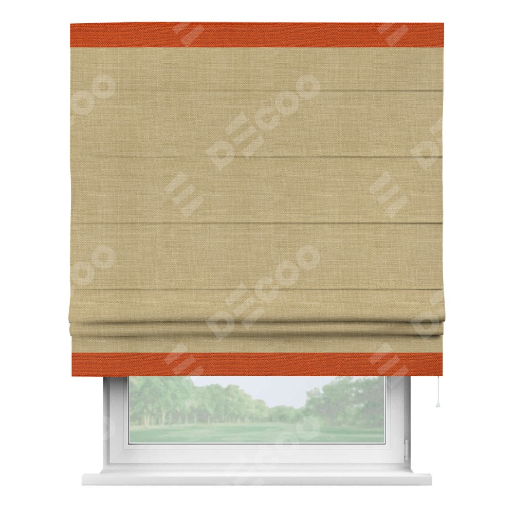 Римская штора производителя «Cortin», используется для проёма, пошита из ткани лён бежевый, артикул 7442. Отделка шторы кантом «Горизонт», ткань для канта используется из льна разной расцветки на выбор. Имеет универсальный механизм и подходит для монтажа: на потолок, на стену и в нишу.
